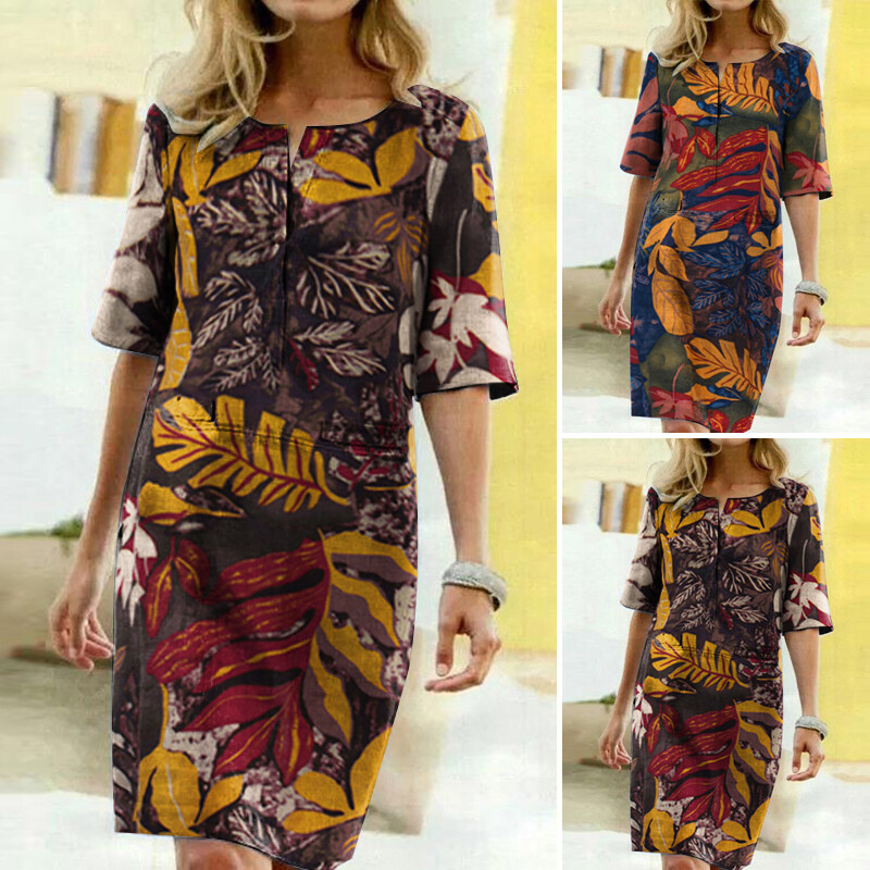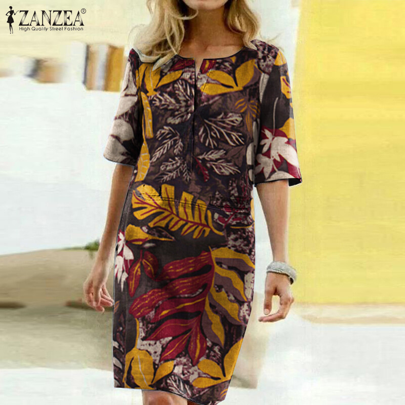 ZANZEA Women Vintage Short Sleeve Sundress Ladies Knee Length Floral Pinted Dress