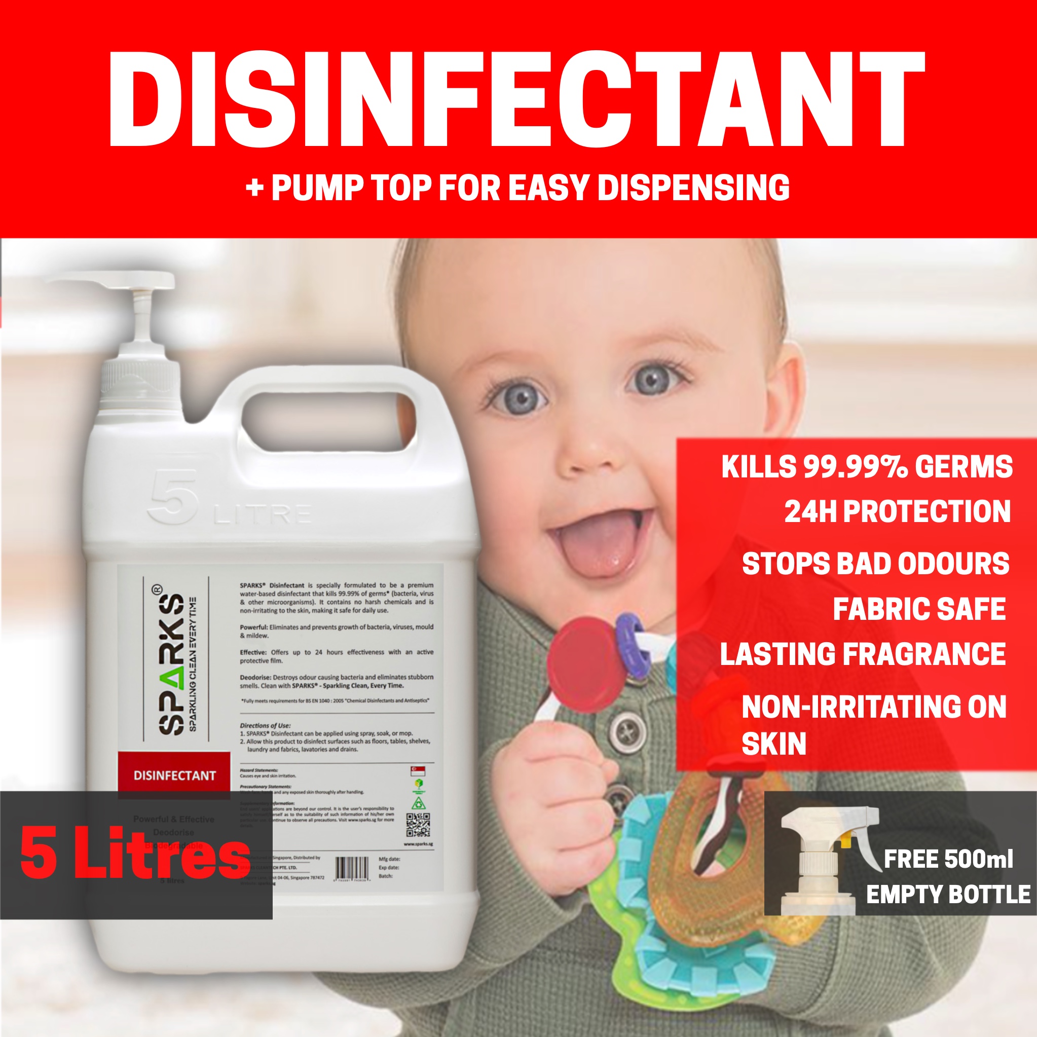 Sparks Disinfectant (5 Litres) with Pump Dispenser Top (inclusive of 500ml plastic spray bottle) - Premium Water Based Sanitiser (Sanitizer) with Multi-Action and Broad Action Kill Against Bacteria, V