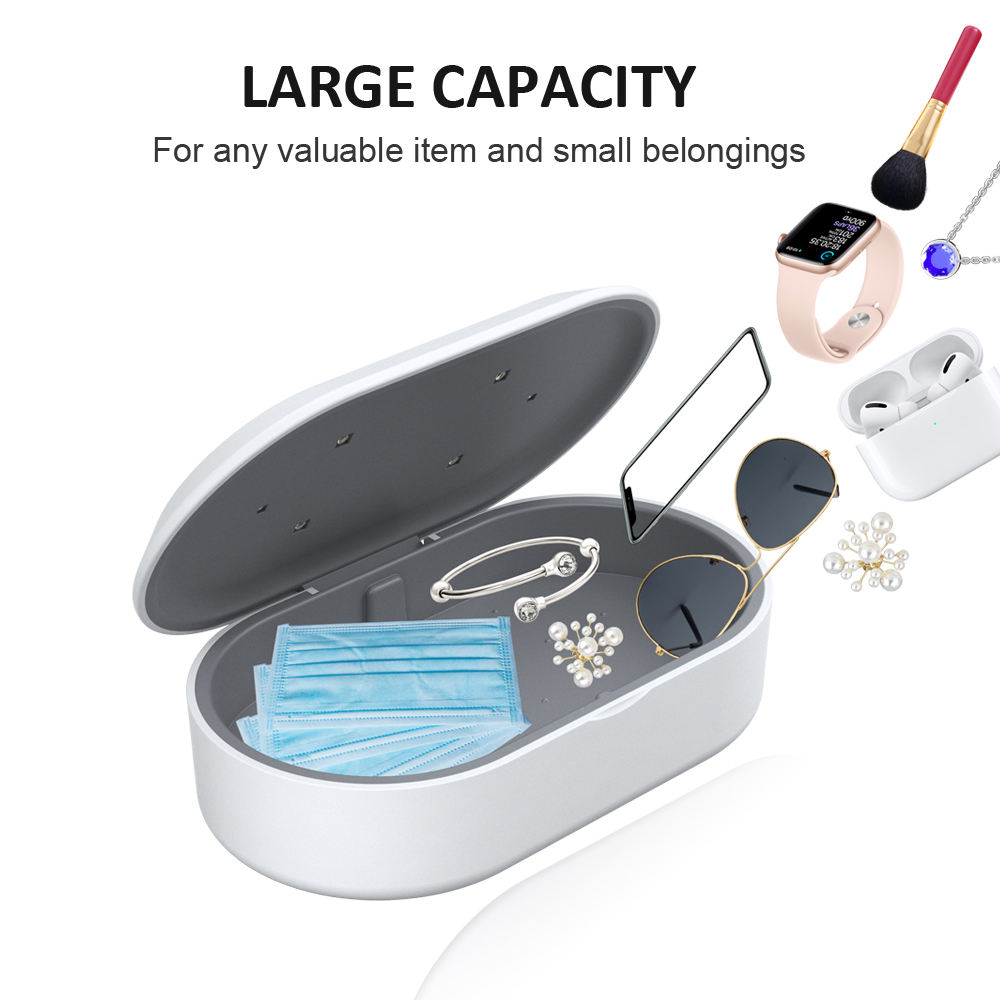 【PERFECT SIZE TO FIT ALL】– Any smartphone or cell phone up to 6.5 inches (including the biggest iPhone, Samsung models) can fit in the UV phone cleaner. What’s more, you can also place your masks, glasses, jewellery, watches, car keys, earpods inside the box to get a complete disinfecting bath.