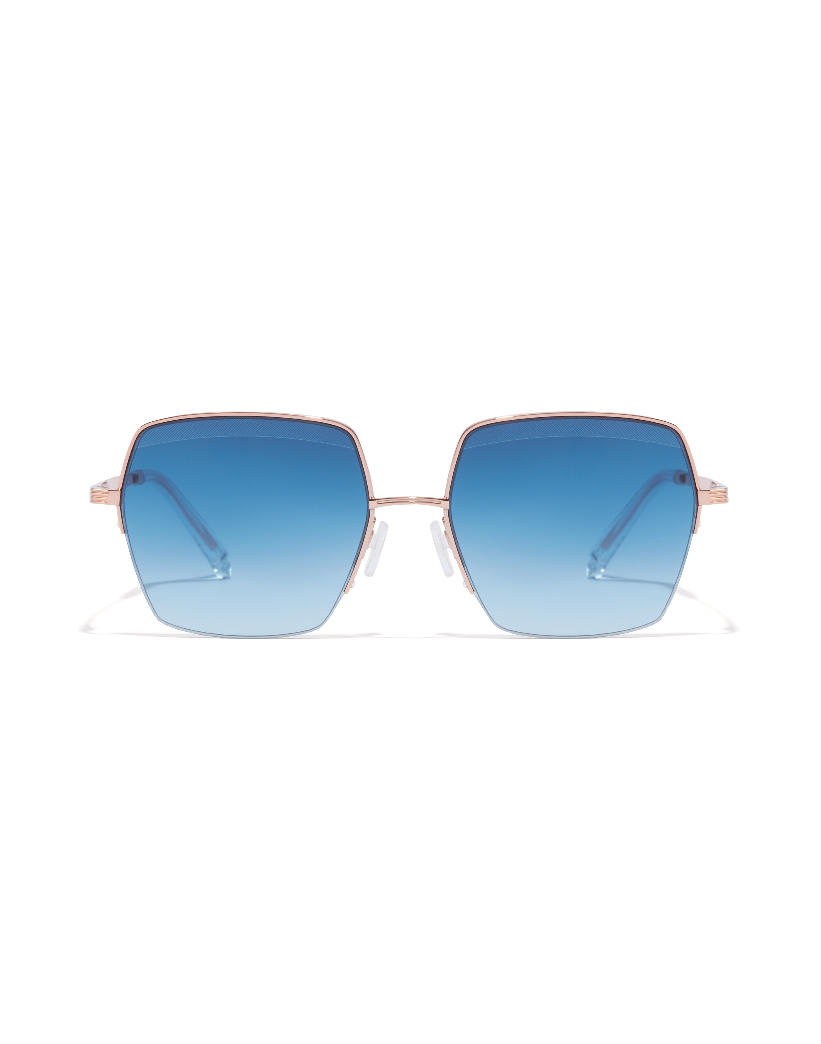 A delicate oversize hexagonal butterfly design with a partial-rim frame. This model combines a slender yet robust polished rose gold stainless steel structure with gradient blue lenses and transparent TR90 earpieces.