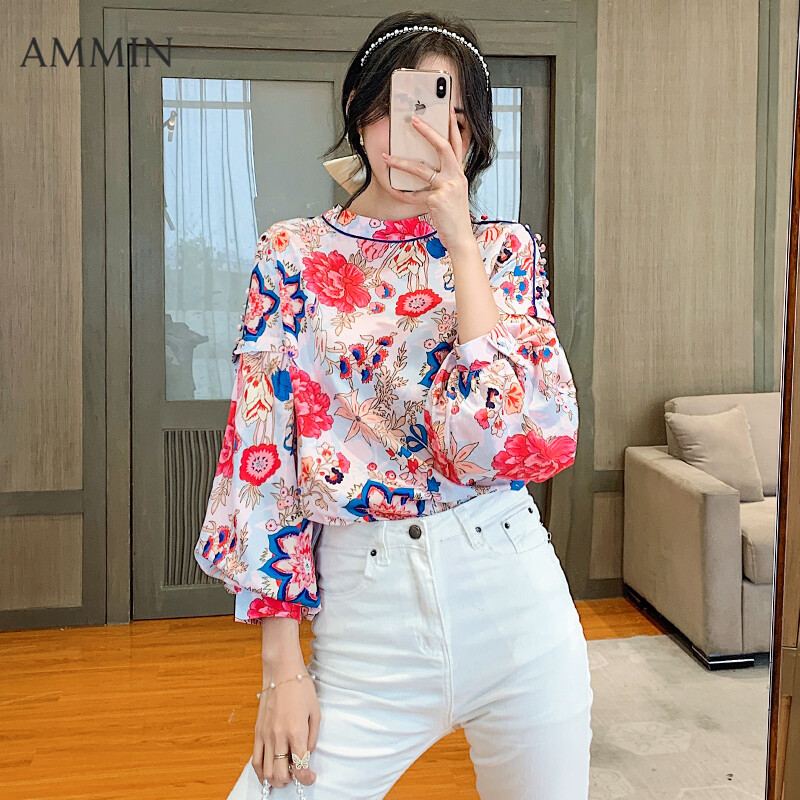 AMMIN Silk Printed Long Sleeve Shirt For Women Fashion Temperament Printed Shirt Stand Collar Lantern Sleeve Mulberry Silk Top