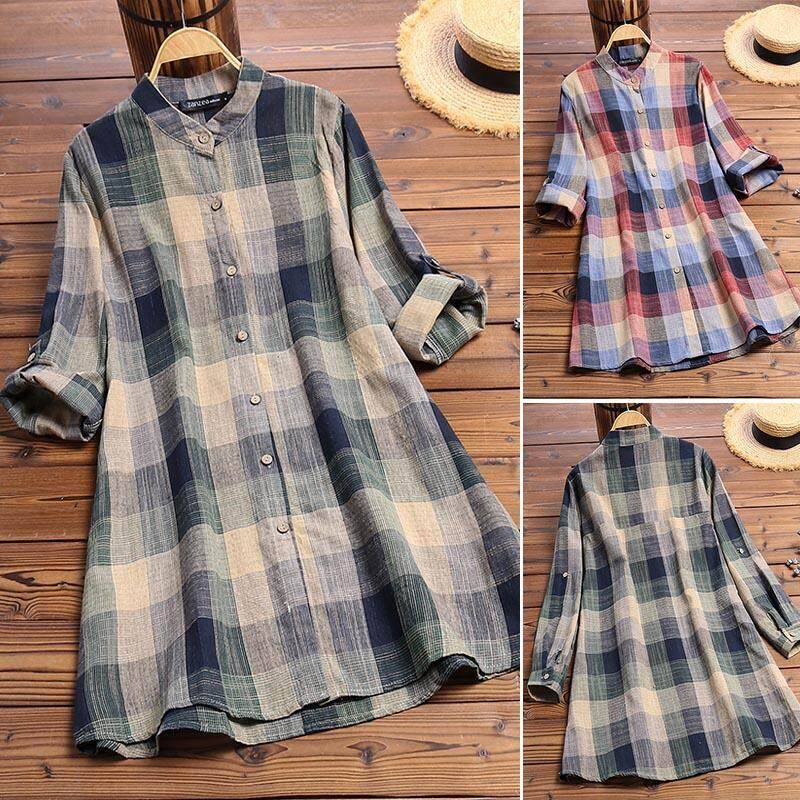 Muangee Women Buttons Down Long Sleeve Plaid Check Shirt Tops Stand Collar Blouse ZANZEA