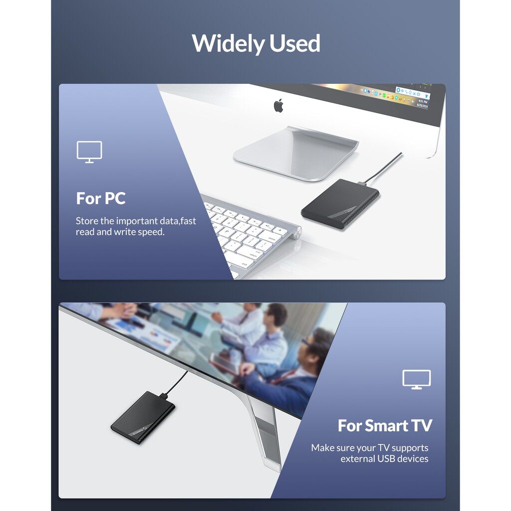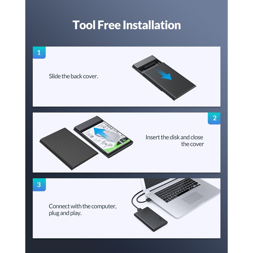 ORICO 2521U3 is a portable 2.5-inch mobile hard disk enclosure. It adopts a tool-free quick installation design and is simple and convenient to use. It adopts SATA3.0 main control chip, supports UASP acceleration protocol, external USB3.0 output interface, and supports up to 5Gbps transfer rate. It is fully compatible with 7-9.5mm 2.5-inch SATA HDD mechanical hard drives/SSD solid state drives, and can be used to connect to PCs, laptops, smart TVs, smart routers, PS4 and other devices.