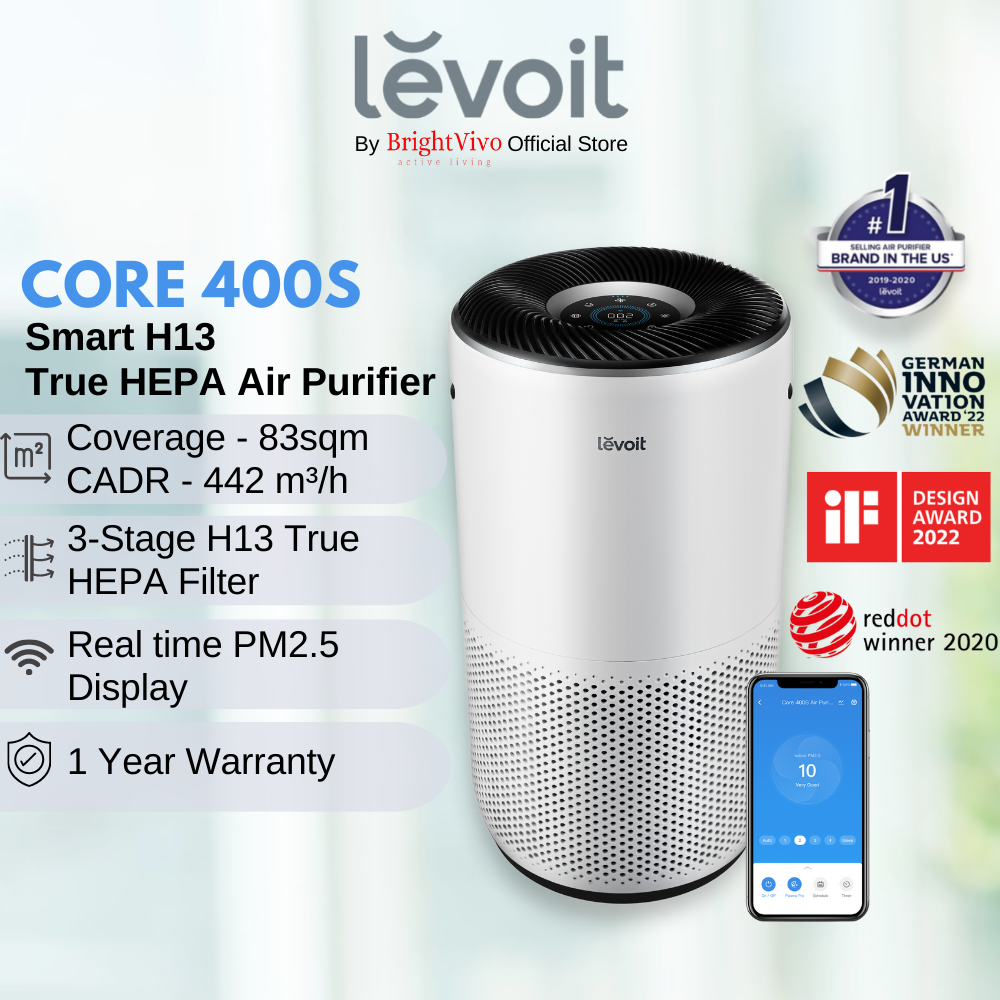 Levoit Core400S Smart Air Purifier, covers 83sqm, 3-Stage H13 True HEPA filters 99.97% of airborne particles 0.3microns in size for Allergies, Pets, Smoke, Dust, for larger room with Air Quality Monit