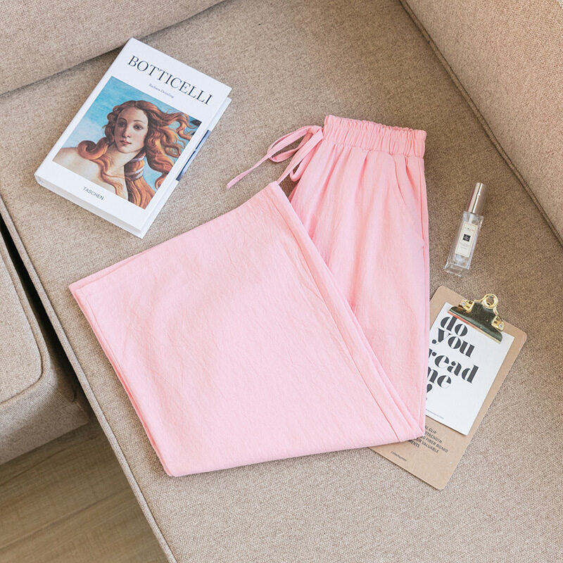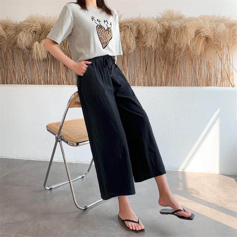 2021 Summer Women Casual Wide-leg Pants Women's Plus Size Loose Cotton Linen Nine-Point Straight Trousers Ladies Home Wear Pants Solid Color Office Work With Pocket Pants Korean