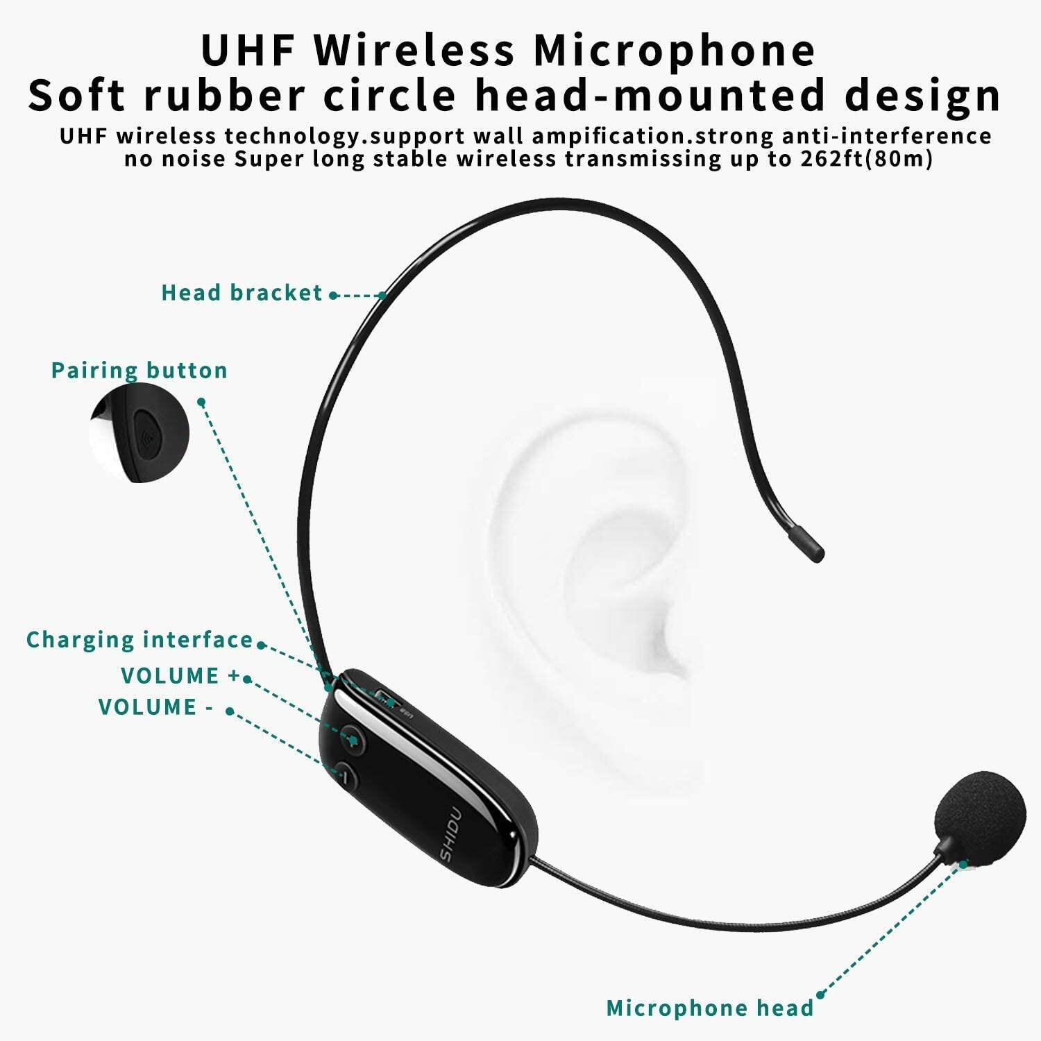 SHIDU S619 UHF Portable Voice Amplifier + S6 Lavalier Wired Mic with UHF Microphone Headset, Mini Bluetooth Pa Speaker 16W 2200mAh Rechargeable Personal Amplifier for Teachers Tour Guide Yoga Training