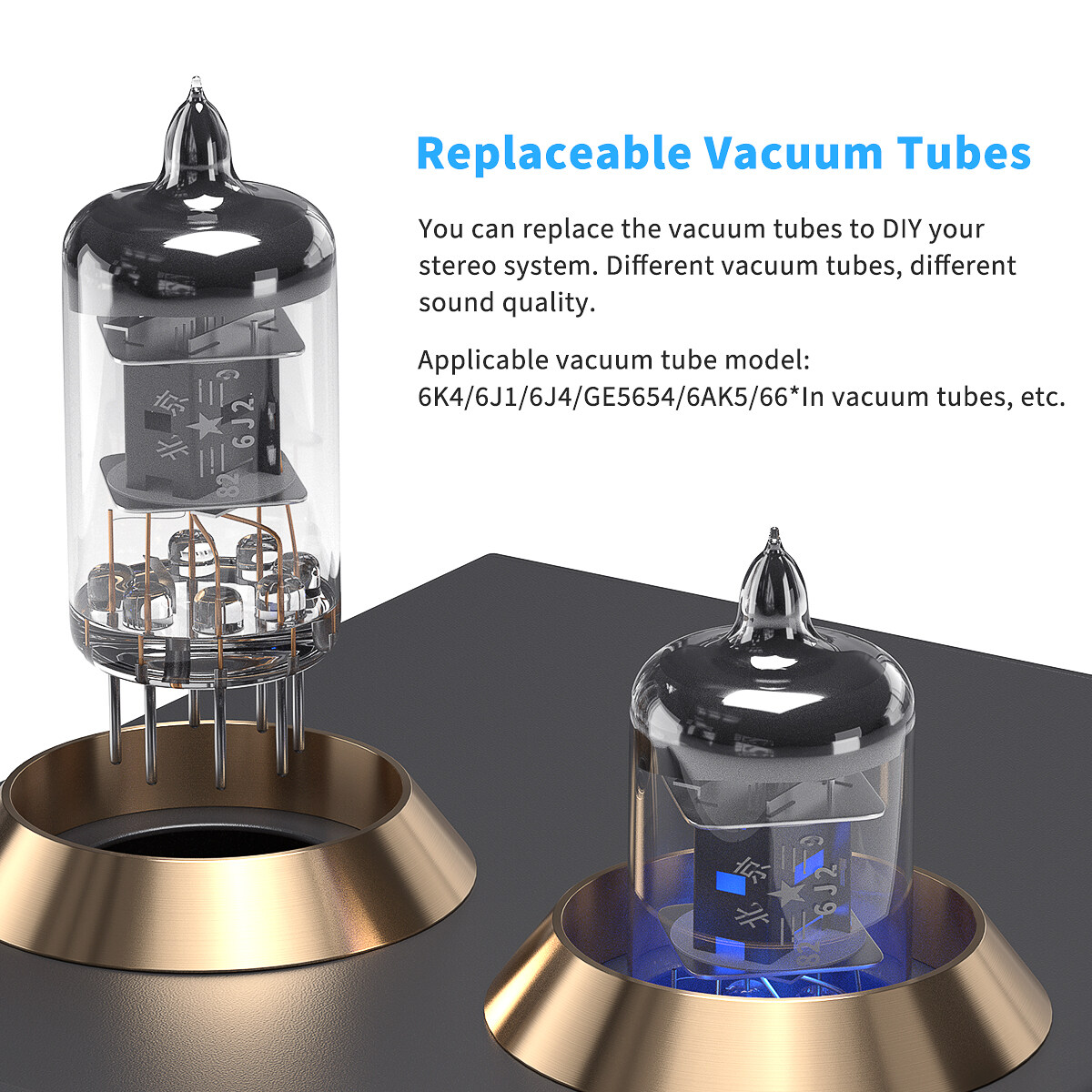 • Applicable vacuum tube model: 6J2/6K4/6J1/6J4/GE5654/6AK5/66*In vacuum tubes, etc. You can replace the vacuum tubes to DIY your stereo system. Different tube with different sound.