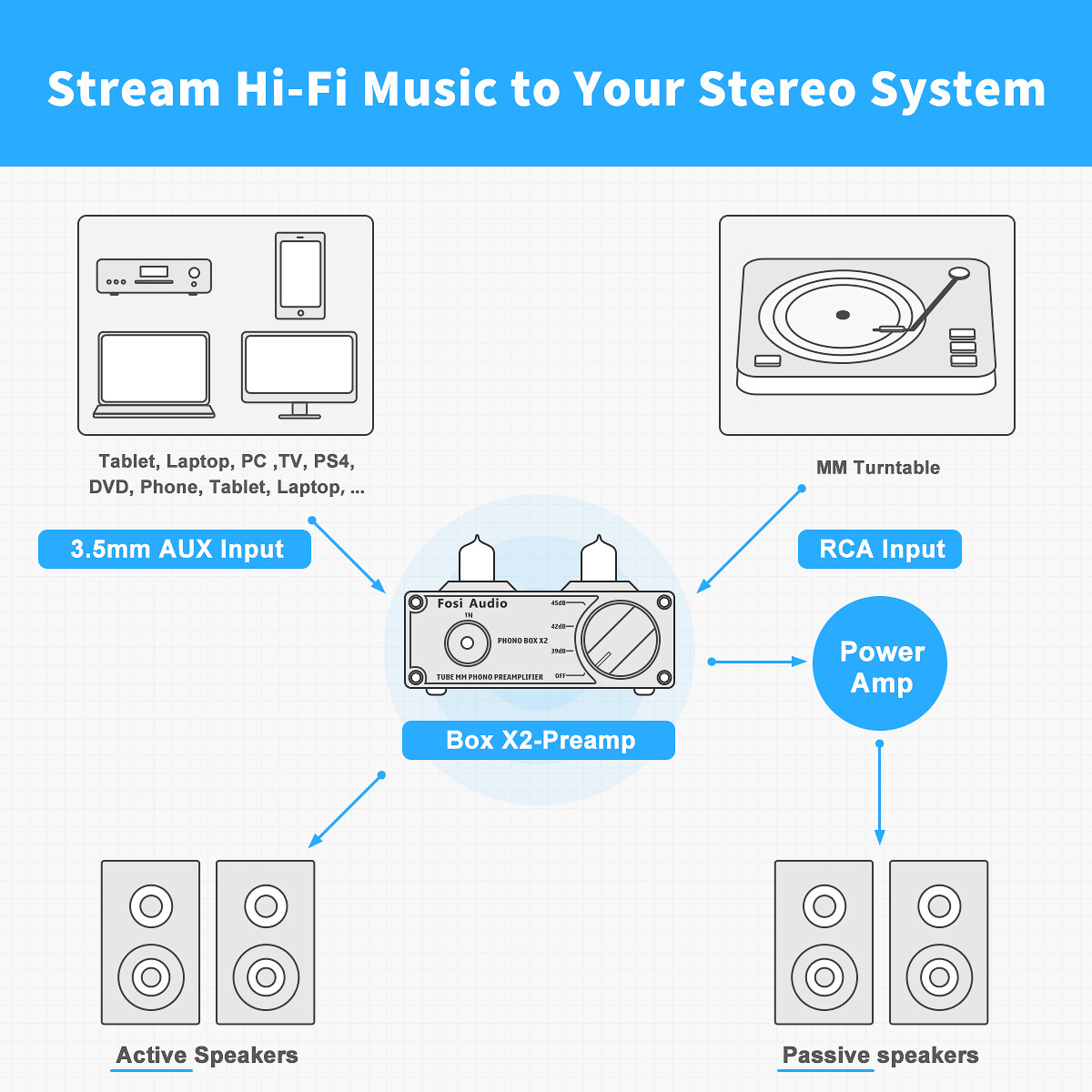 Notice: BOX X2 is only a preamplifier, not amplifier, can not be connected with passive speakers directly, If you need connect BOX X2 with passive speakers, you need to connect it with an amplifier then connect the amplifier with your passive speakers.