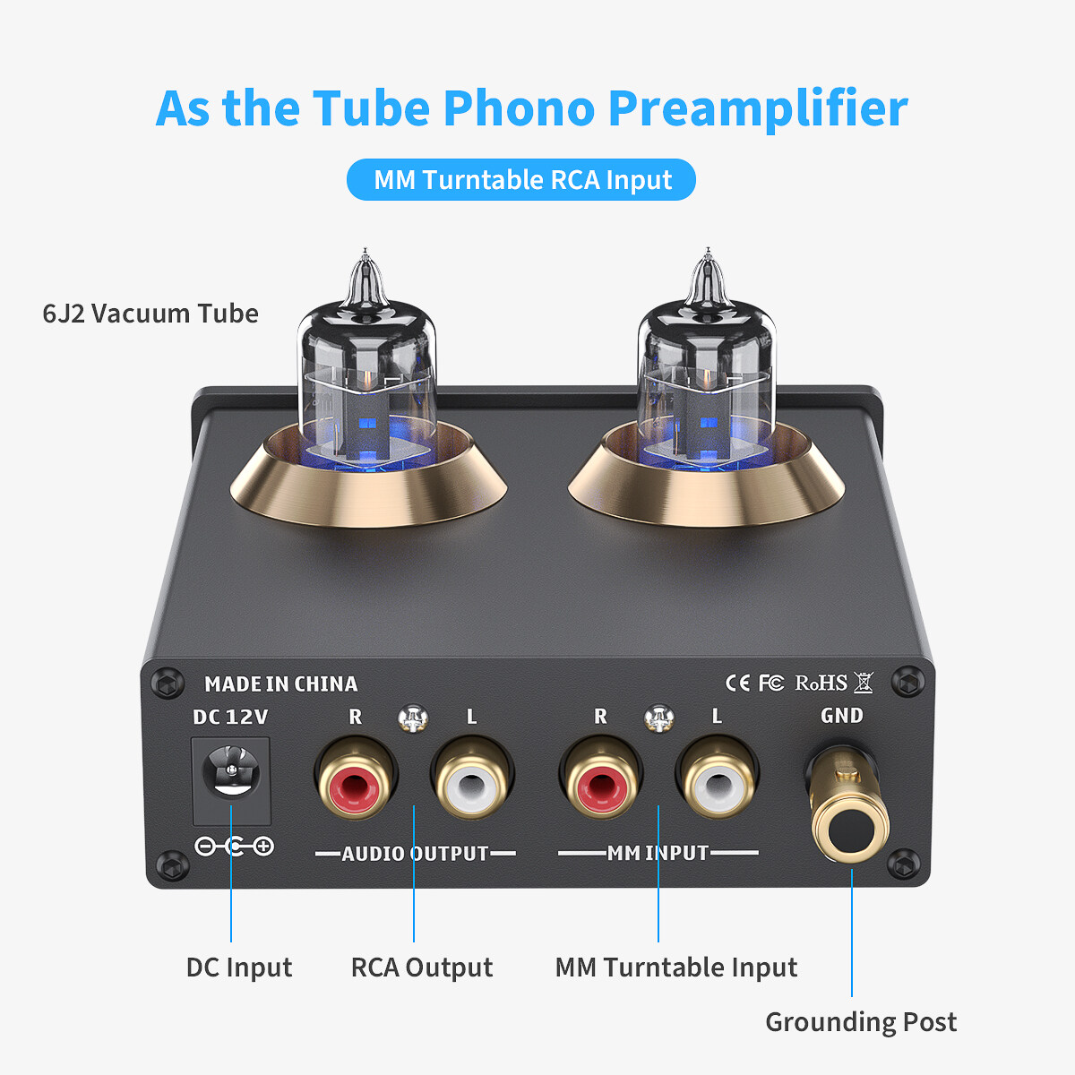 • Tube MM Phono Preamplifier: Converts phono signals to Line Level Signals with low-noise integrated circuits and high-quality components to remove low-frequency noise ensure clear sound quality. Designed with grounding post to protect your turntable.
