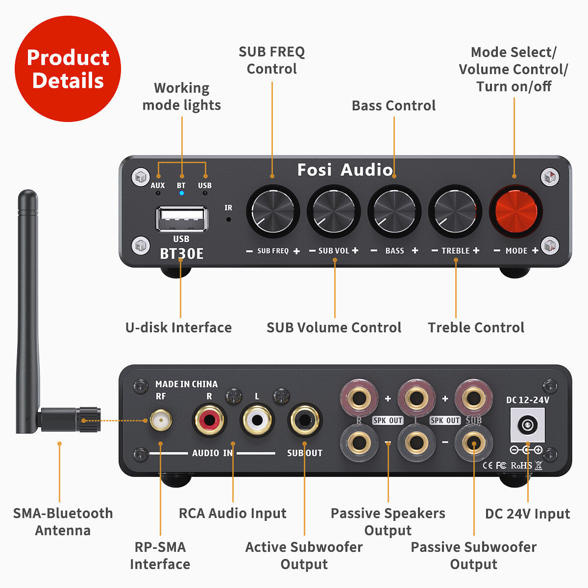 U-disk: USB 2.0, compatible with USB 3.0; Support Music Format: MP3, WMA, APE, FLAC, WAV