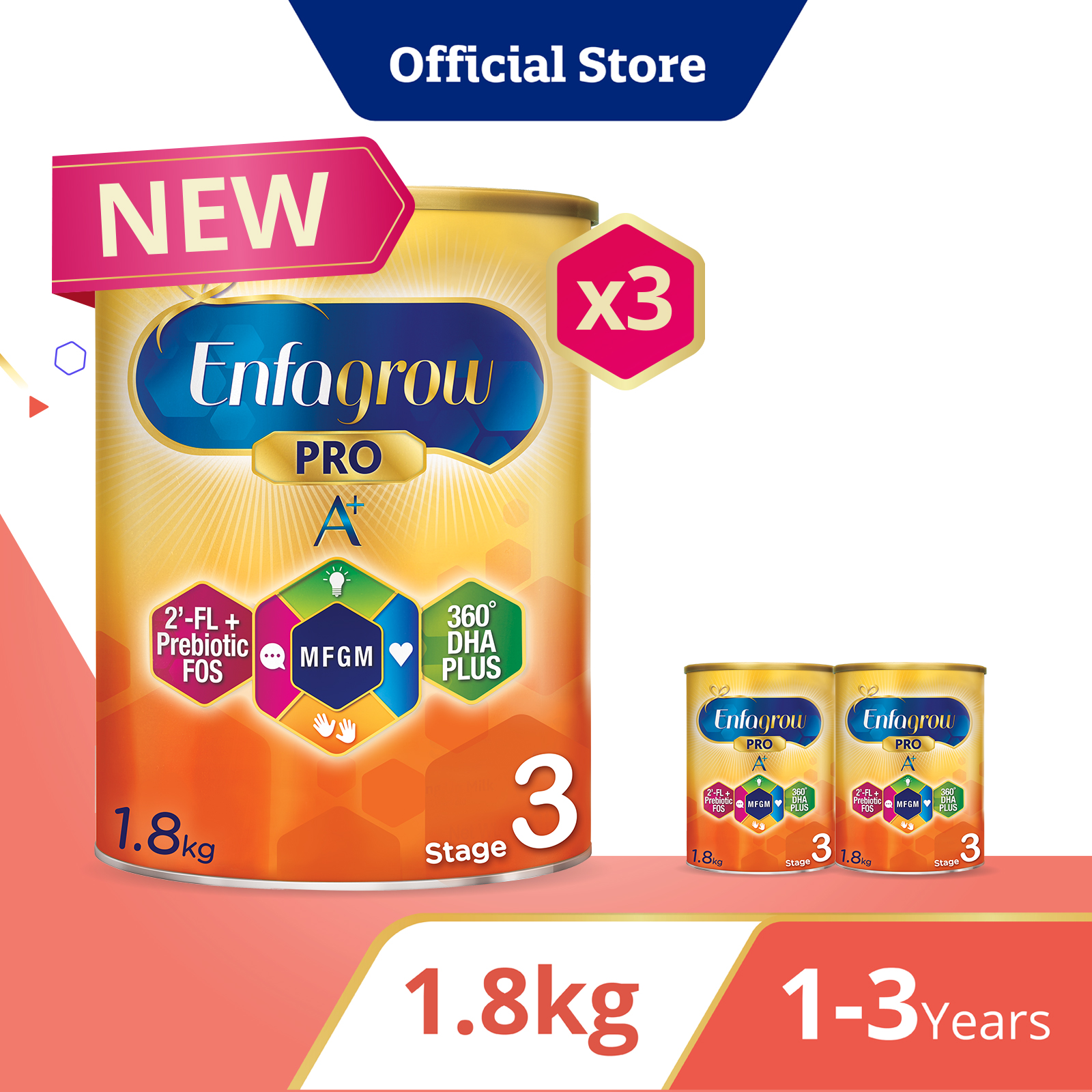 [Bundle of 3][NEW MFGM + 2'-FL] Enfagrow Pro A+ Stage 3 1.8kg for Children (1-3Y