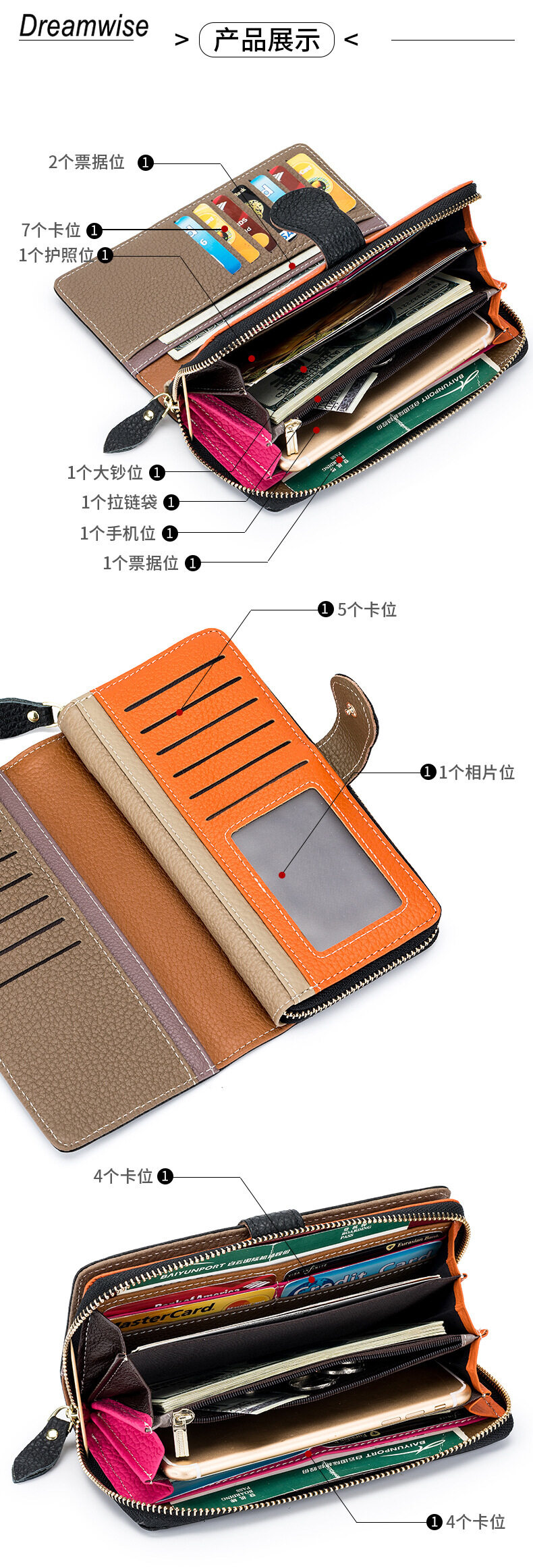 20个插卡位,4个大钞位,2个票据位,1个拉链袋,1个护照位,1个手机位