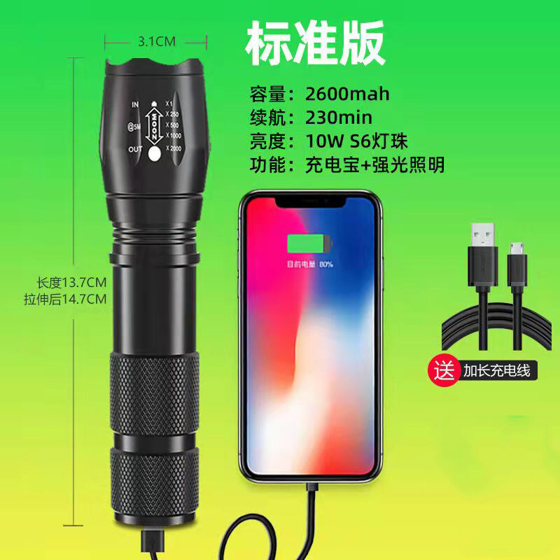 Emitter type: Cree T6Bezel color: blackCasing material: high quality aluminum alloyMode: high/middle/low/strobe/SOS