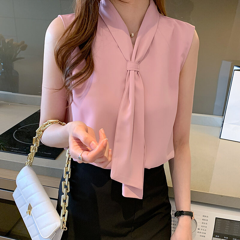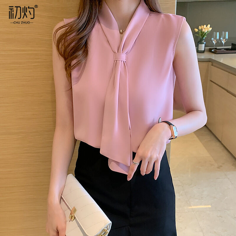 Chiffon Shirt Women's Design Sense Niche V-neck Shirt Bow Ribbon Temperament Professional Inner Sleeveless Top Summer