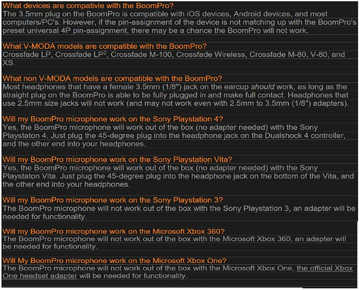 The BoomPro Microphone is the detachable, flexible, and state-of-the-art boom microphone for communication and gaming. It enhances voice clarity and reduces background noise, an essential for gaming and conference calls. Its built to last with a durable reinforced cable, 24K gold-plated plug and flexible boom arm thats adjustable to be positioned wherever you like. The control clip has built-in mute and rotary volume controls. Compatible with all smartphones, tablets, PCs, notebooks and gaming consoles via 3. 5mm plug and headphones with a 3. 5mm cable input.Source Compatibility: * Sony PlayStation 4 * Sony PlayStation Vita * Sony PlayStation 3 (needs third party adapter) * Microsoft Xbox One * Updated Xbox One Controller w/3.5mm (1/8") headphone jack (no adapter needed) * Original Xbox One Controller needs official Microsoft headset adapter * Microsoft Xbox 360 (needs third party adapter) * Smartphones, tablets, PCs and notebooks via 1/8" (3.5mm) plugV-MODA