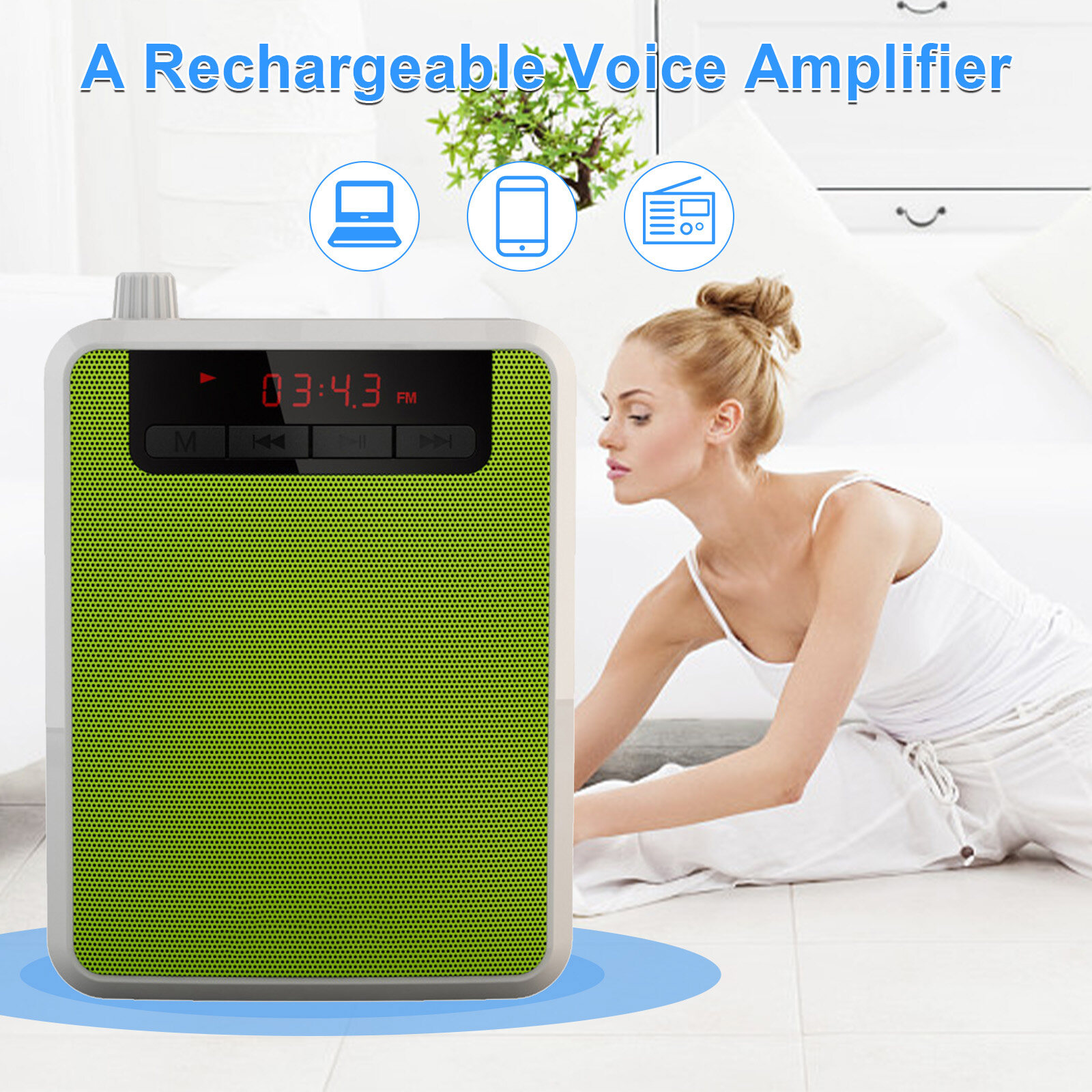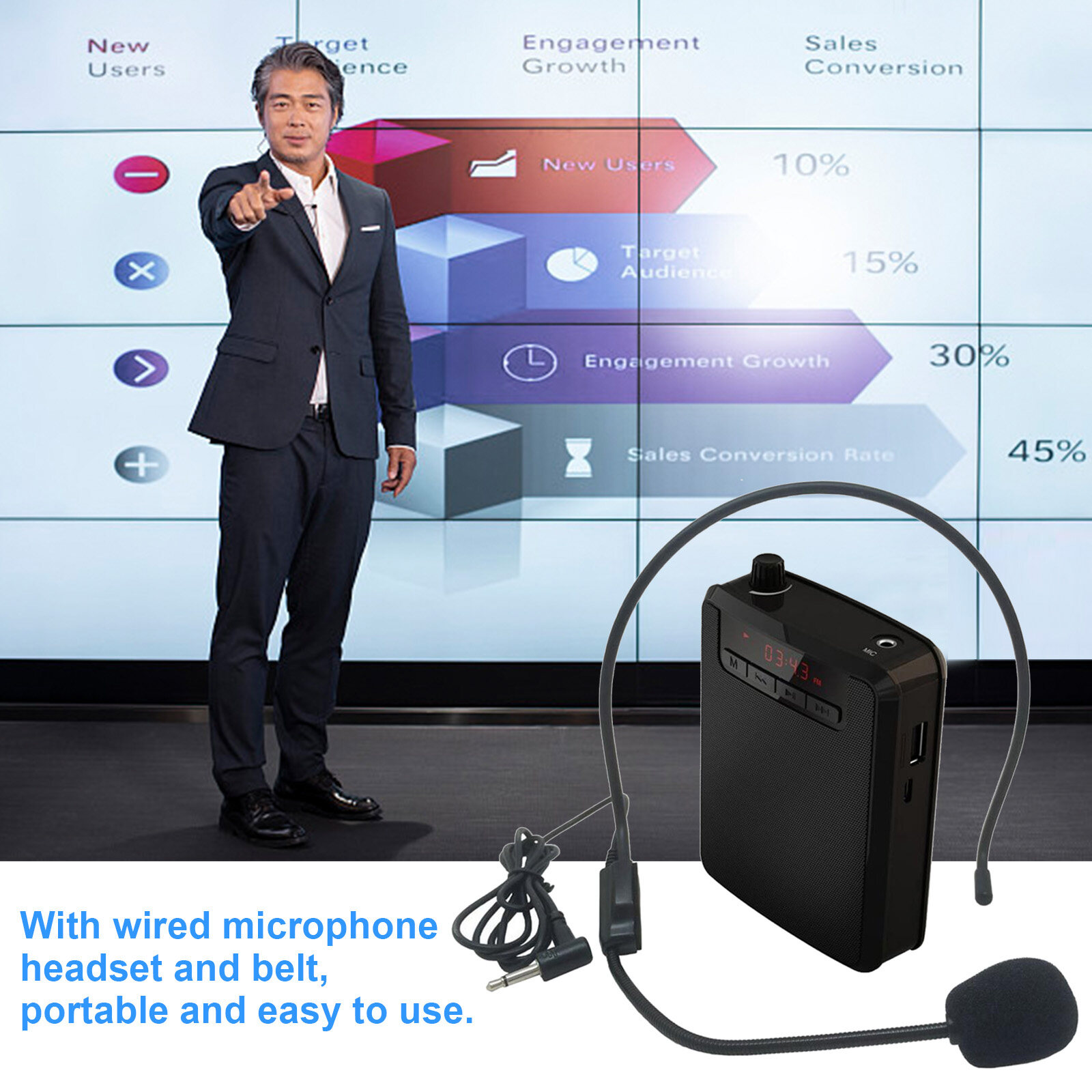 This is a rechargeable mini voice amplifier for teachers, training, coaches, tour guides and presentations, etc. Equipped with wired microphone headset and belt, it is portable and easy to use.