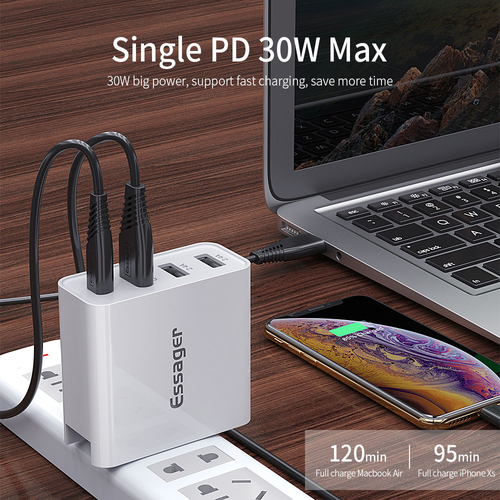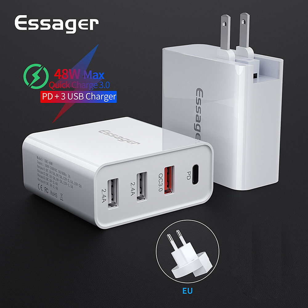 Essager48W 4 Ports Quick Charger PD TypeC + USB QC3.0 Turbo Wall Charger Ponsel Cepat untuk iPhone12 11 Pro max Xiaomi