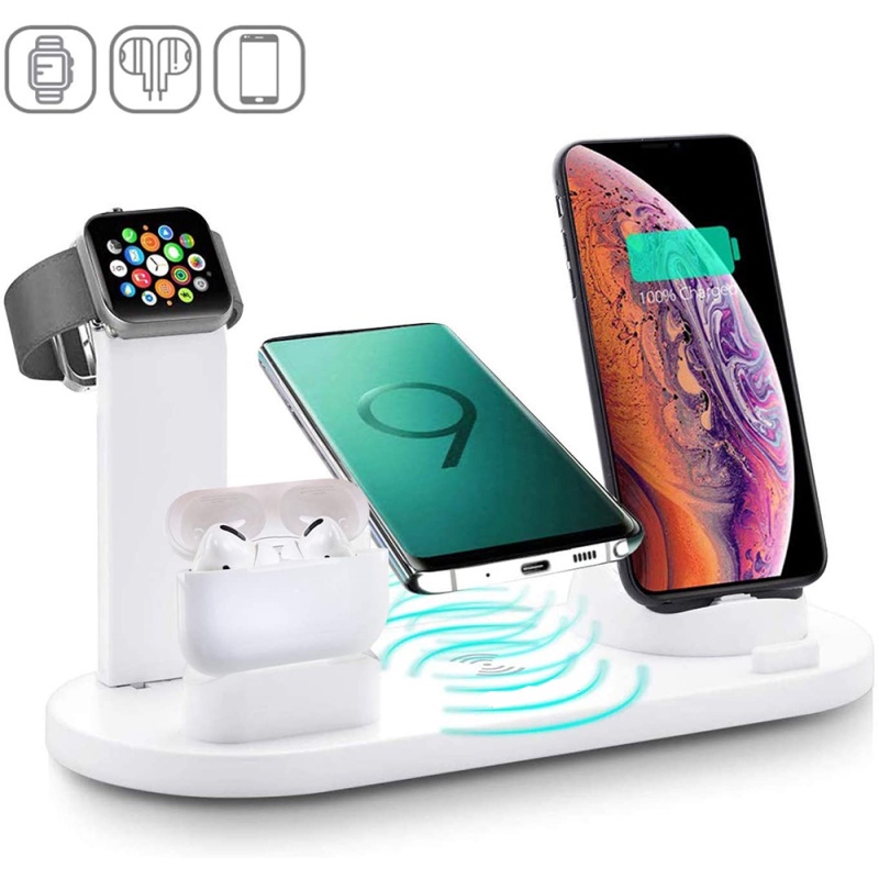The Smart charging station combined qi fast wireless charger with 3 connectors base charger, iWatch ,Airpods charger and a USB outlet in one holder, support charging your apple watch, Airpods,iPhone/Samsung simultaneously. The 3 connectors base is rotary at 360°, Suitable for iPhone ,Android Type-c and Android Micro-usb cell phones