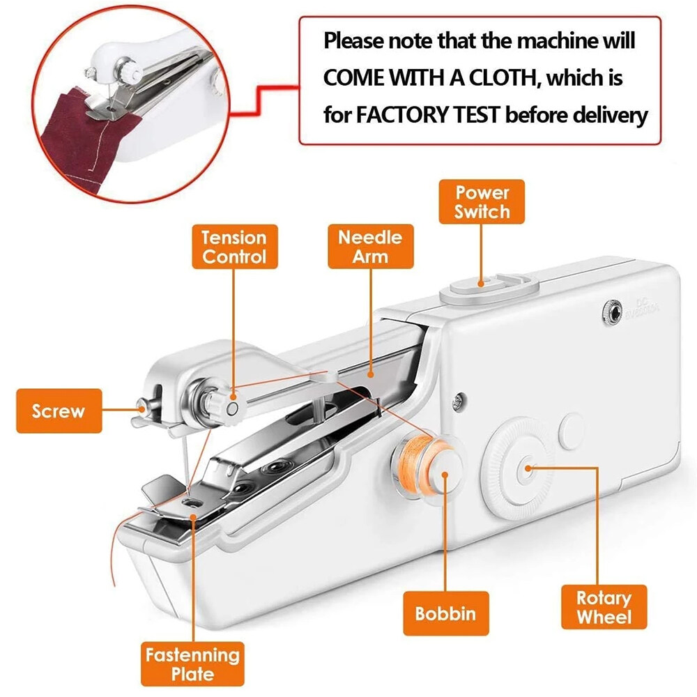 - Package included:1 x Sewing machine (Batteries not included);1 x Needle;3 x Bobbins with thread;1 x Needle threader;1 x User manual;1 x A piece of fabric