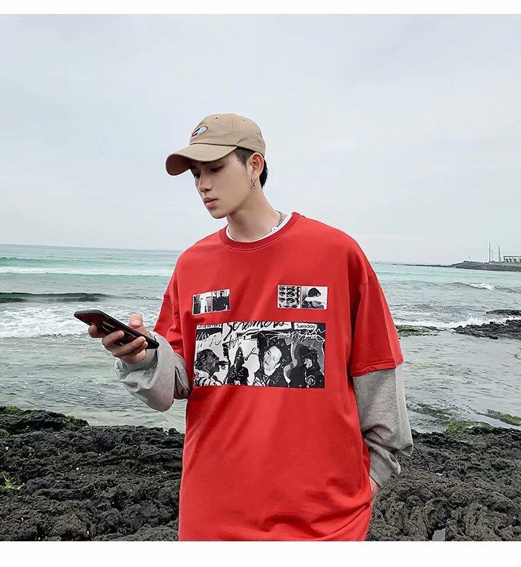 t shirt Men Long Sleeve 2 in 1 Korean Style New Oversize Graphic Print Tee Fashion Tops Loose Casual t-shirt