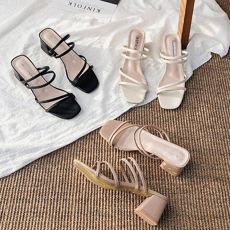 Women Sandals Ladies Square Heels Elegant Summer Slippers Outside Cross Tied Leather Female Slides 2021 Fashion Woman Sandals