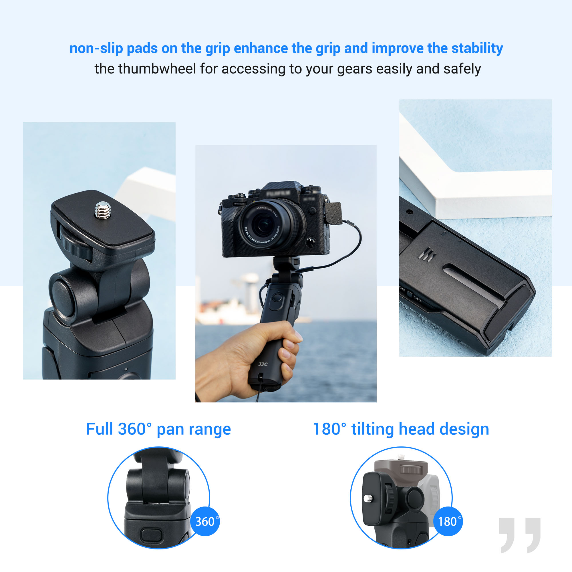 Can be used as a hand grip or as a mini tripod