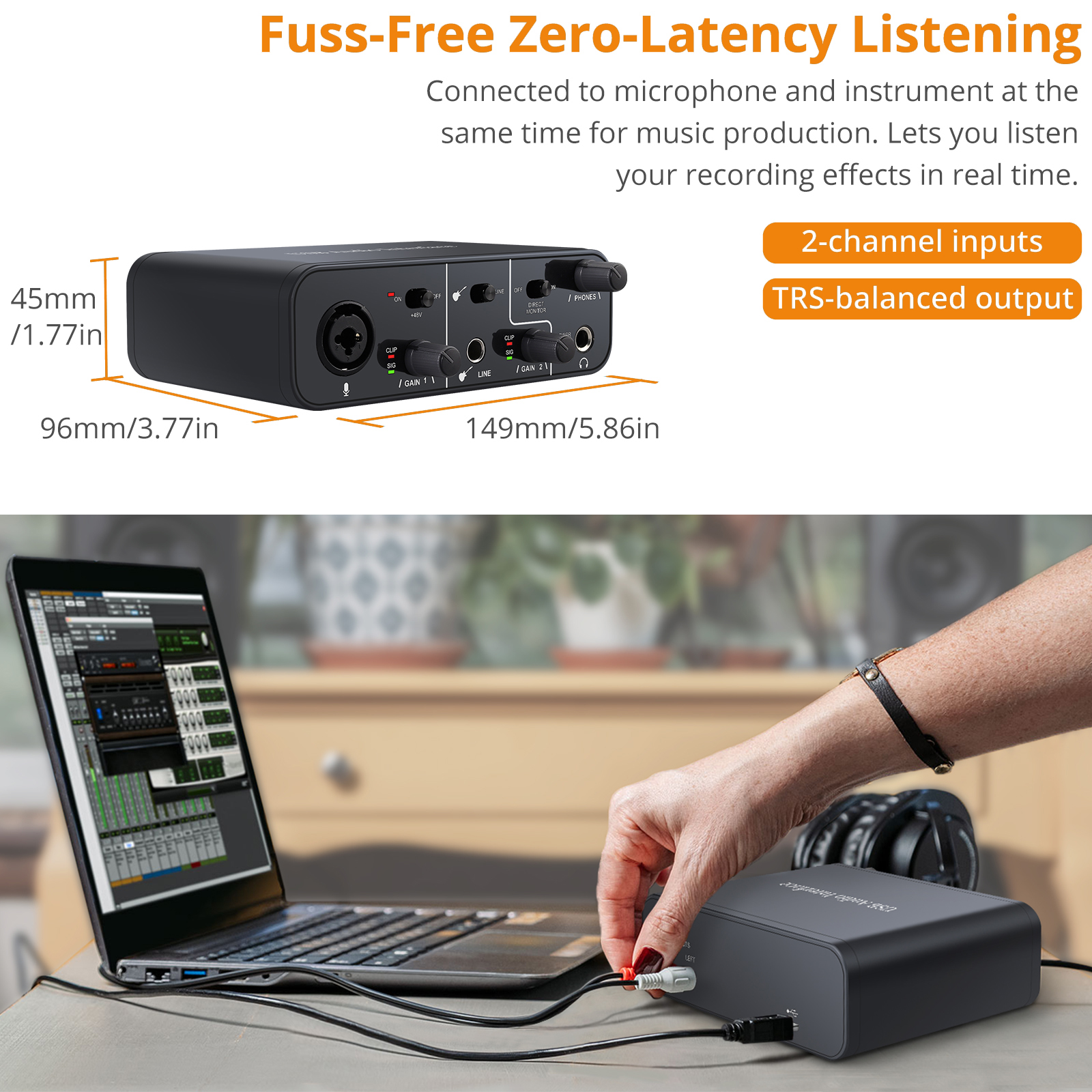 4. The sound card is small and easy to carry, even on the go, you can prepare for various recording and production scenarios. On tour, at home, on stage, or at rehearsals, this USB external sound card gives you a whole new level of freedom in recording, editing and mixing, and any audio you record is studio-quality, meaning you don't have to go to the studio for a while. and then re-record.