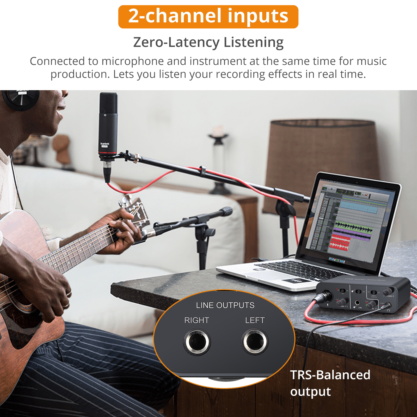 2. The USB external sound card has left and right channels, the XLR port (microphone) input is the left channel, and the 6.35mm port (guitar and keyboard instruments) input is the right channel, you can connect the microphone and the instrument at the same time for music production, you get full Lag-free sound that accurately hears and processes your recordings in real-time, giving musicians a better performing recording device.