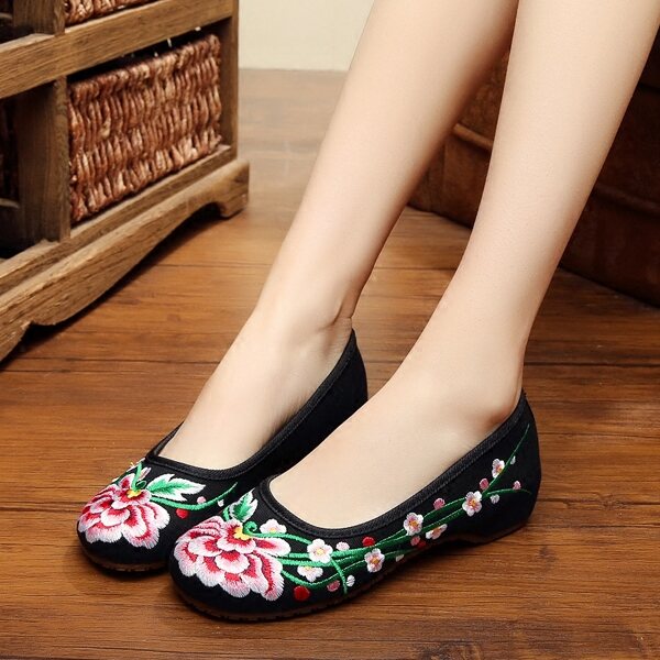 new style ankle-wrapped peony old Beijing beef tendon bottom cloth shoes red black hidden height embroidered shoes dance Hanfu shoes autumn women