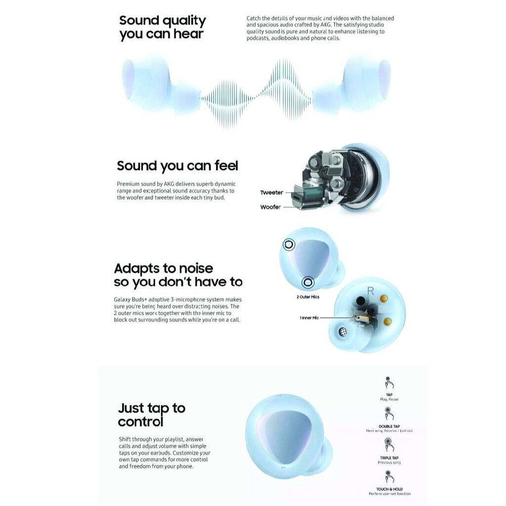 Independent double headset design,completely out of line of bondage.Super compatibility, it compatible with 99% of the bluetooth smart device in the market.Super portable bluetooth headset, intelligent answer of reject calling, super long standby time.Stereo,excellent sound quanlity noise cancelling,free smoothly communicate.way speakers for rich soundSAMSUNG GALAXY BUDS PLUS.