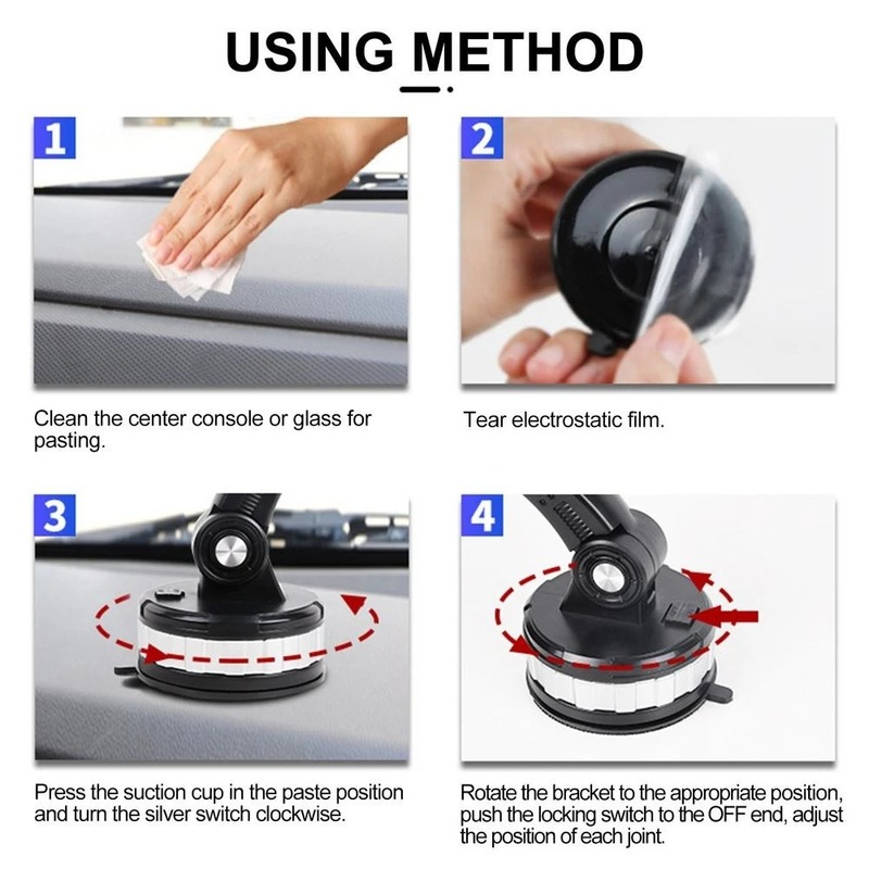 Installation method: 1. Clean the place to be pasted. 2. Tear off the film. 3. Press the suction cup at the appropriate position and turn the switch clockwise along the silver part. 4. Turn the support to the appropriate position, push the locking switch to the off end, and adjust each joint.