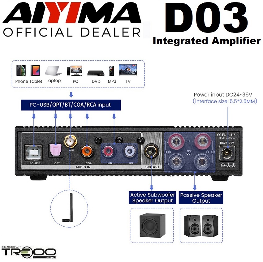 AIYIMA D03 Wireless Bluetooth Receiver/Streamer & Hi-Fi Integrated Amplifier (Official local stock - SG/UK plug)
