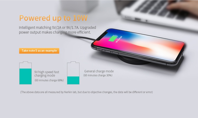 Powered up to 10W - Intelligent matching 5V/2A or 9V/1.7A. Upgraded power output makes charging more efficient.