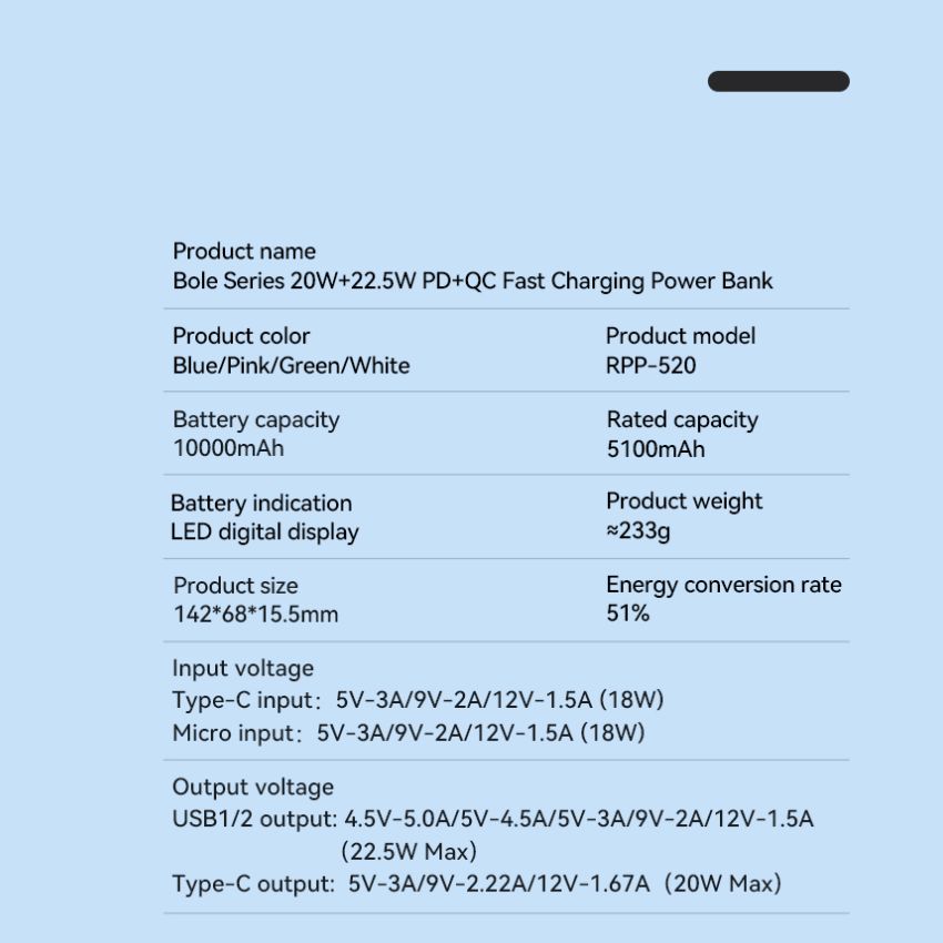 REMAX POWER BANK BOLE SERIES 2USB + TYPE-C 22.5W 10000mAH remax rpp-520/rpp-521/rpp-522