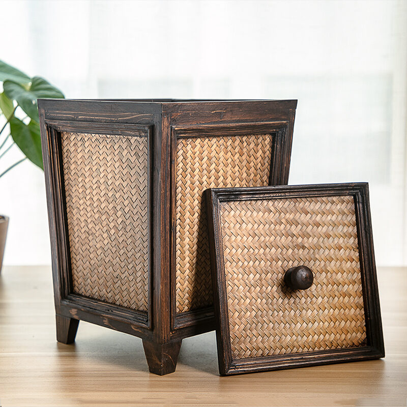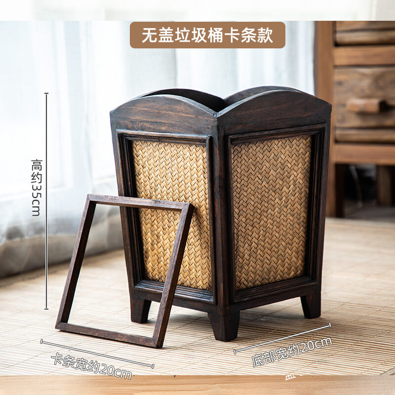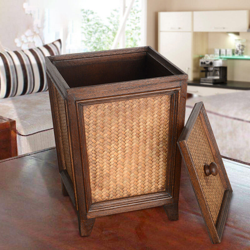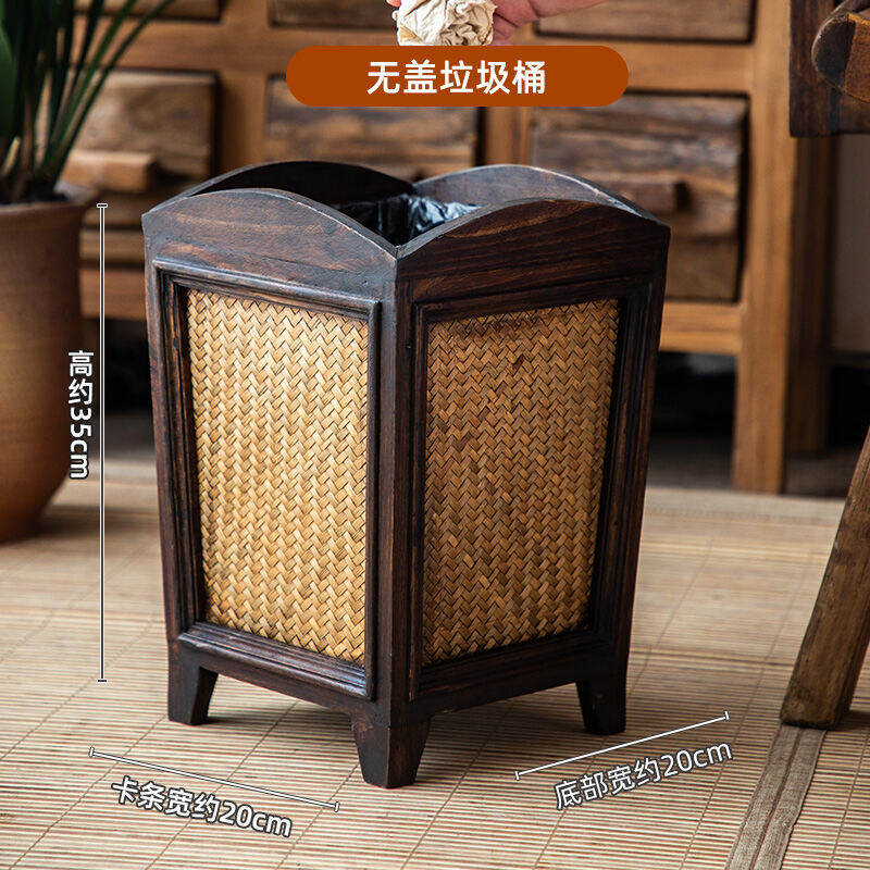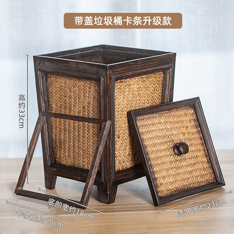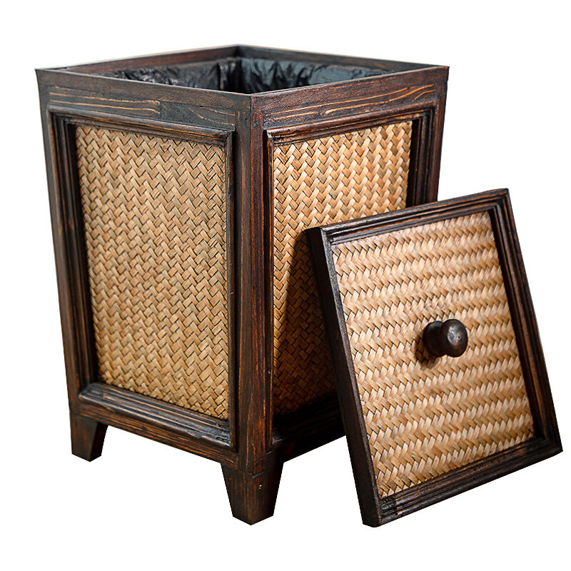 Retro Rattan Wooden Toilet Paper Basket with Lid Living Room Tea Room Kitchen Home Creative Chinese Solid Wood Trash Can