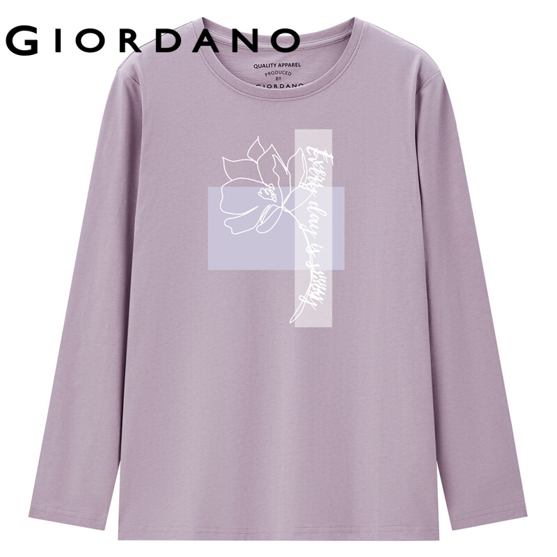GIORDANO Women Huaxiansheng Series T-Shirts Spring Fall 100% Cotton Long Sleeve Casual T-Shirts Crewneck Print Tee 99392104