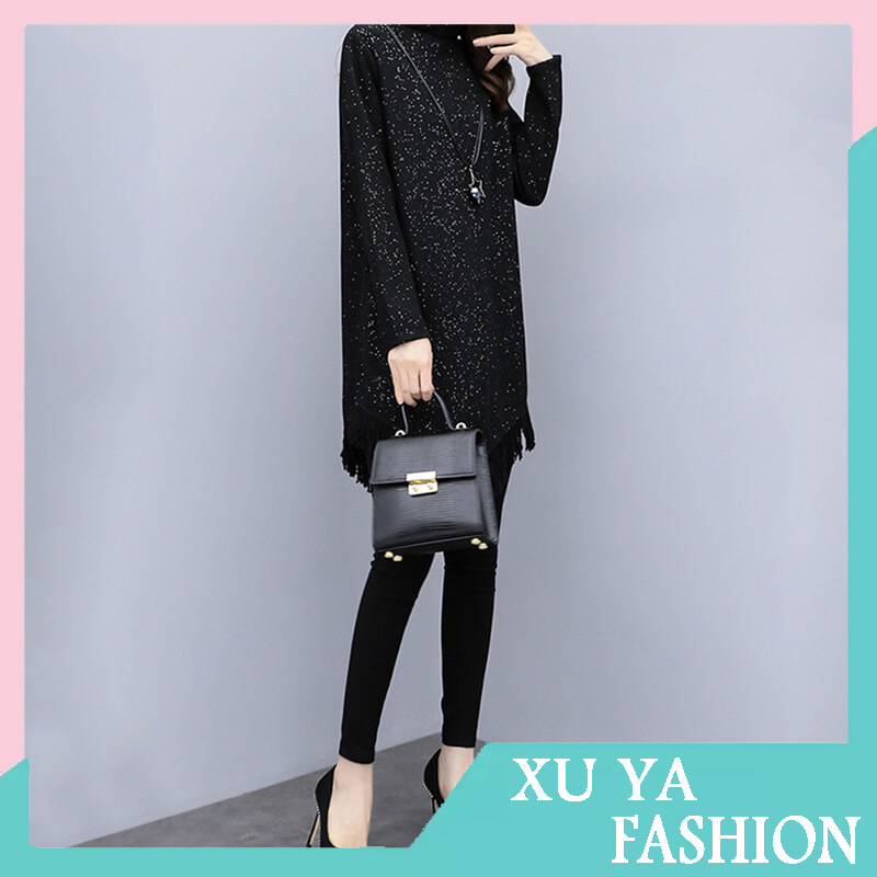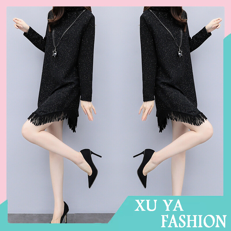 Women Large Size Bottoming Dress Fleece Lined Thickened Long Sleeves Midi Skirt Half Turtleneck Solid Color Dress