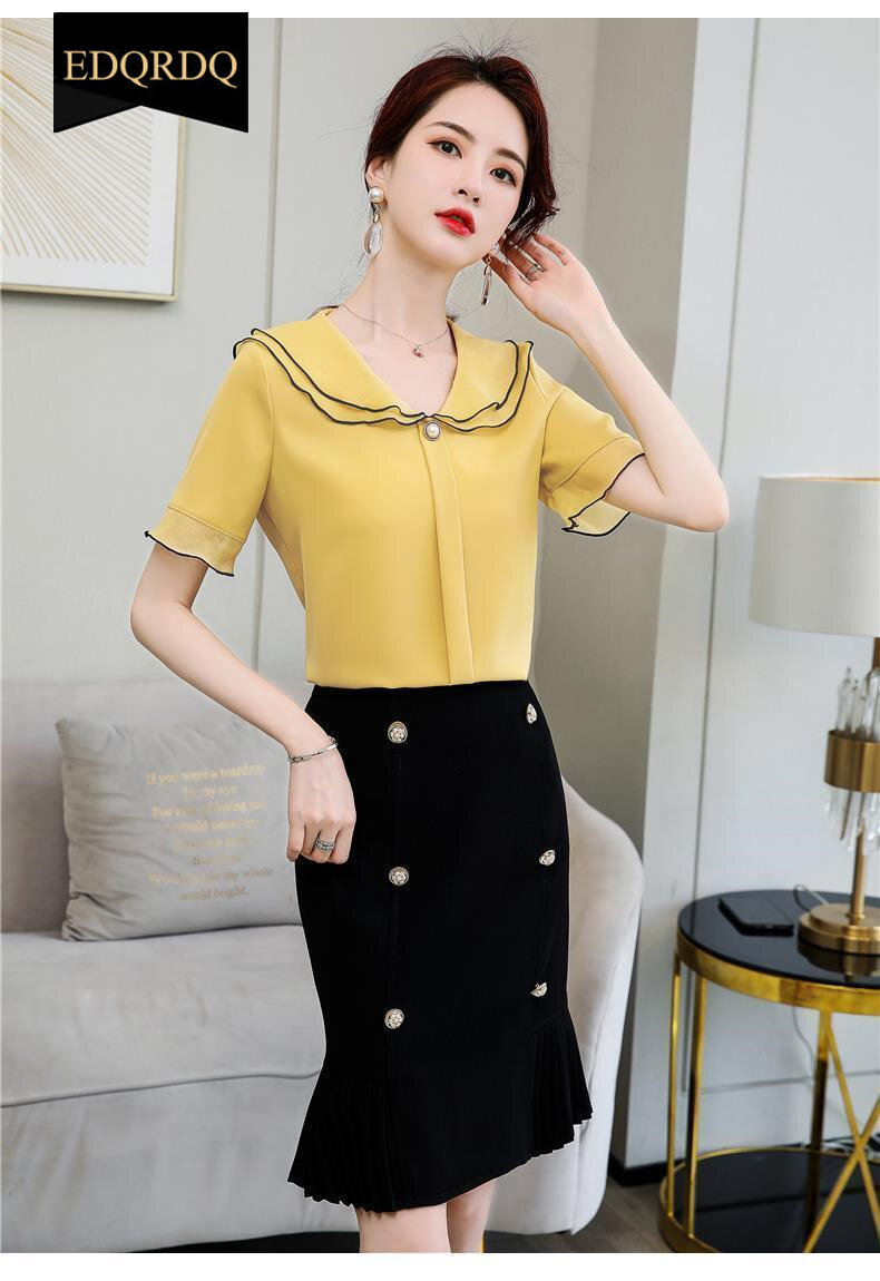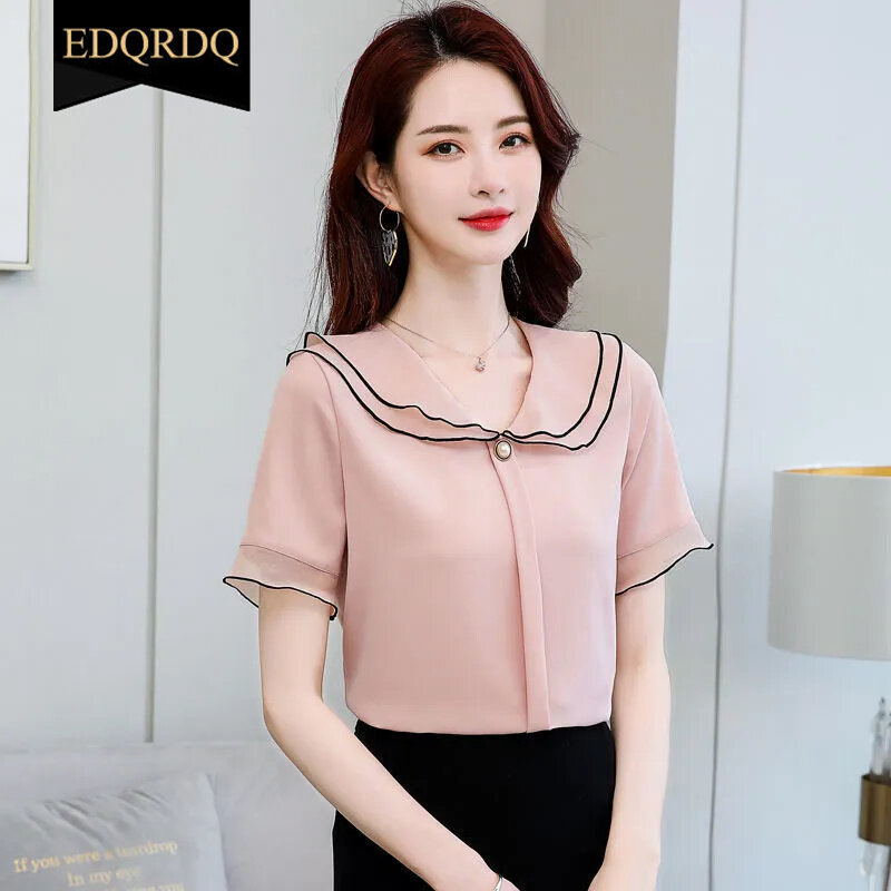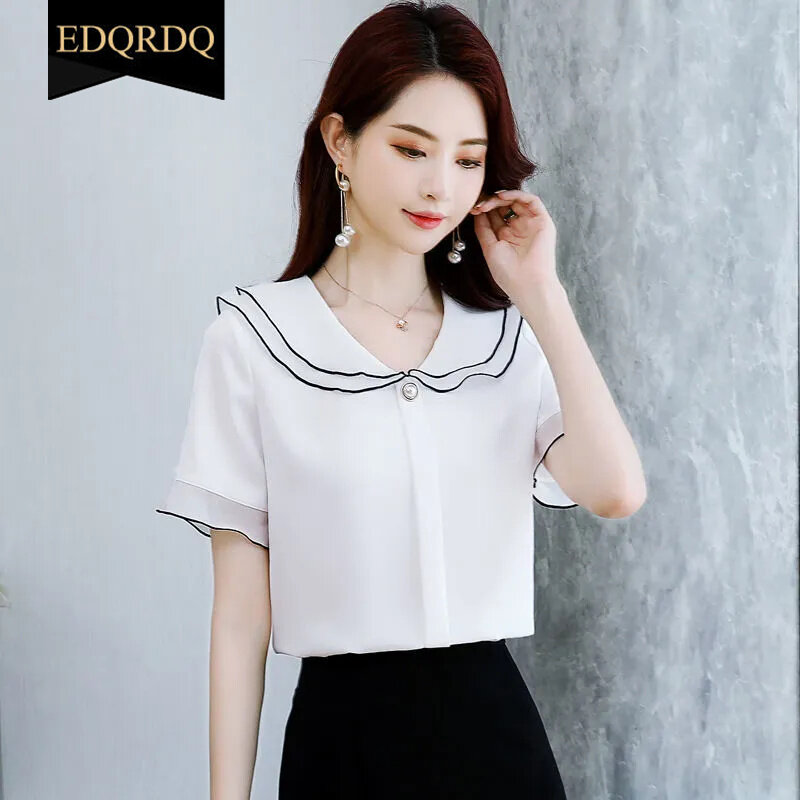 EDQRDQ Women's Doll Collar Puffy Sleeve Solid Color Chiffon Tops Short Sleeves Ruffle Blouse