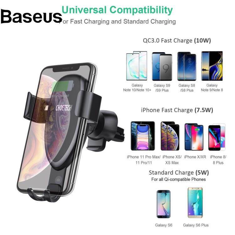 Baseus CHOETECH T536-S 10W Wireless Charger Gravity Auto Clamping Suction Cup Mount Phone Holder with Air Vent Clip