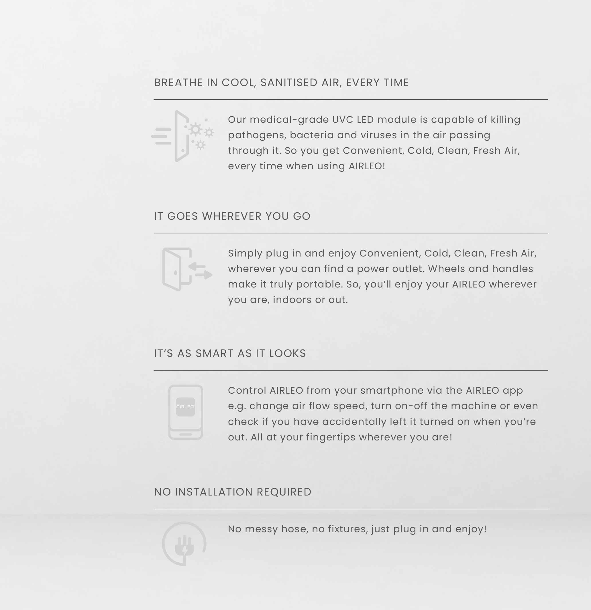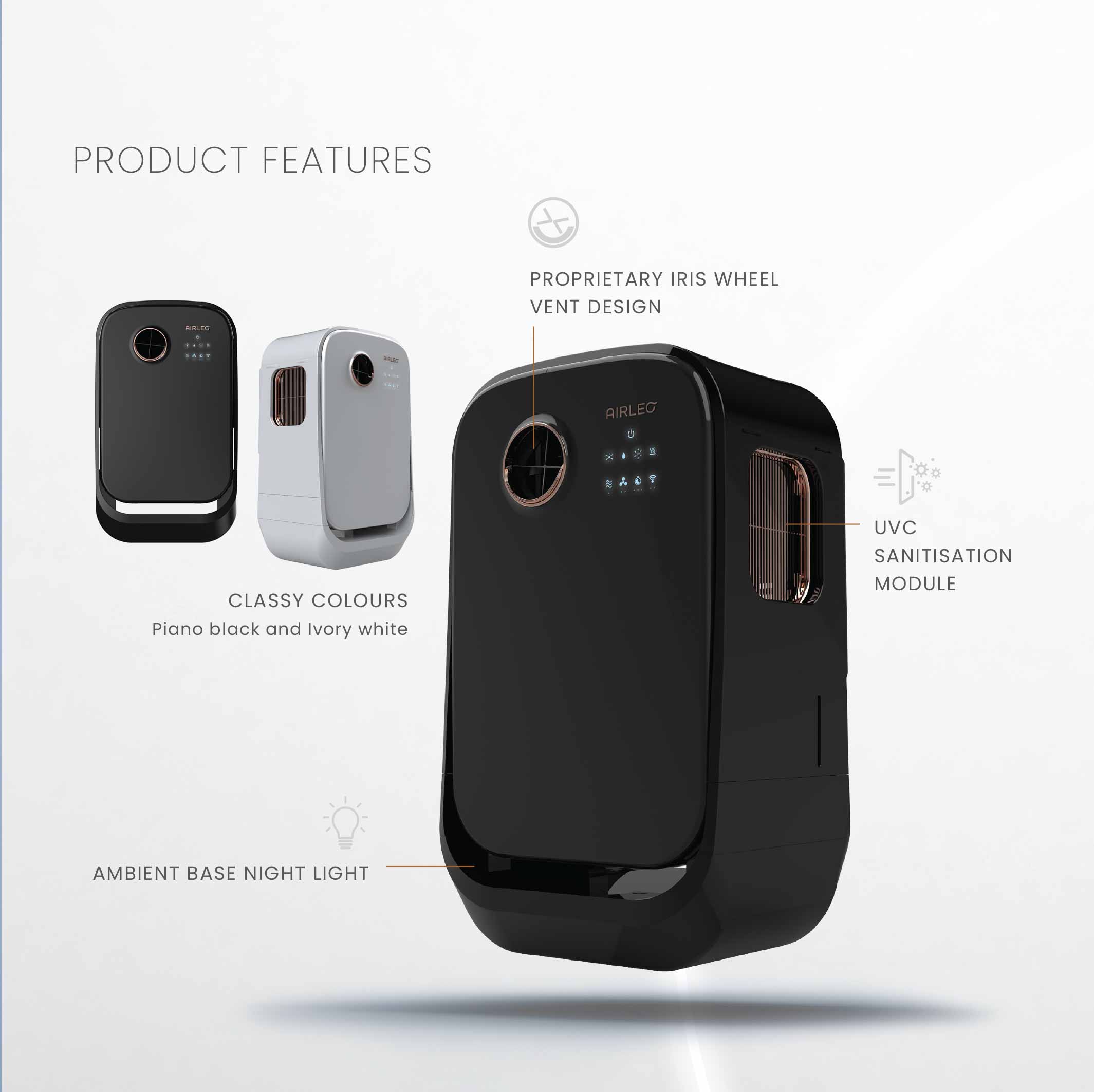 Introducing AIRLEO, a revolutionary way of enjoying cold, clean fresh air that is convenient, energy-efficient and environmentally friendly. It is a first-of-its-kind innovative air-cooling solution that no longer requires the usual hot exhaust air hose that needs installation, thanks to its proprietary patented technology, termed Low-Temperature Evolutionary Ozone (LEO).
