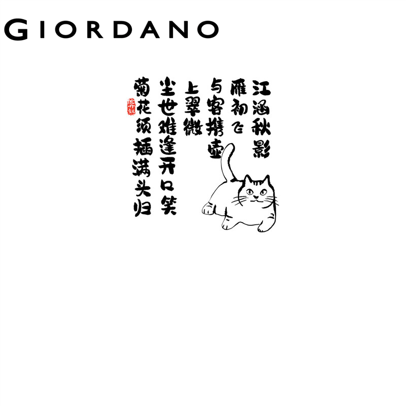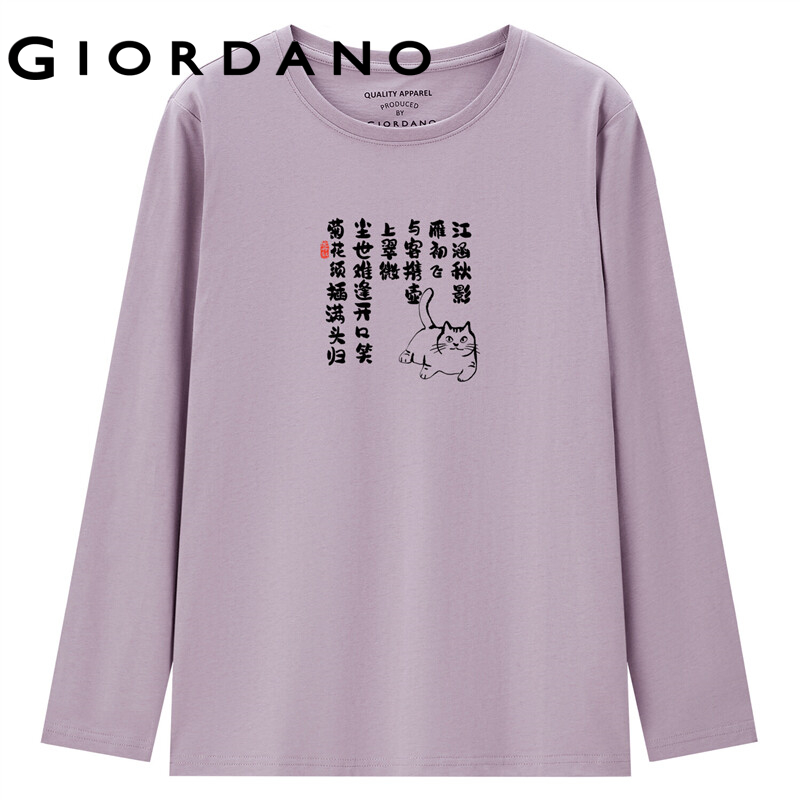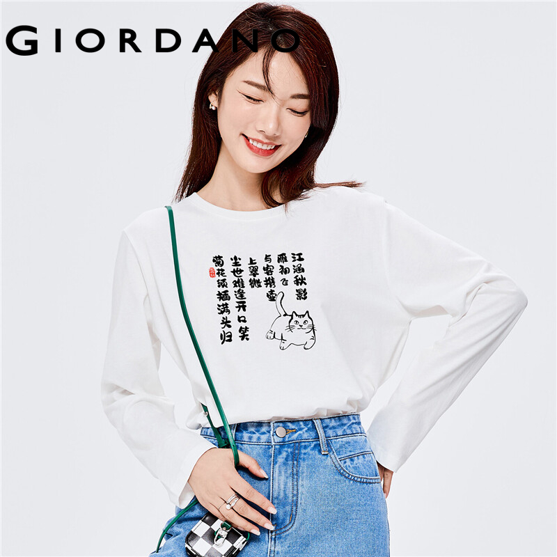 GIORDANO Women Tang Poem Series T-Shirts Simple Print Crewneck Relaxed T-Shirts 100% Cotton Long Sleeve Casual T-Shirts 99392156