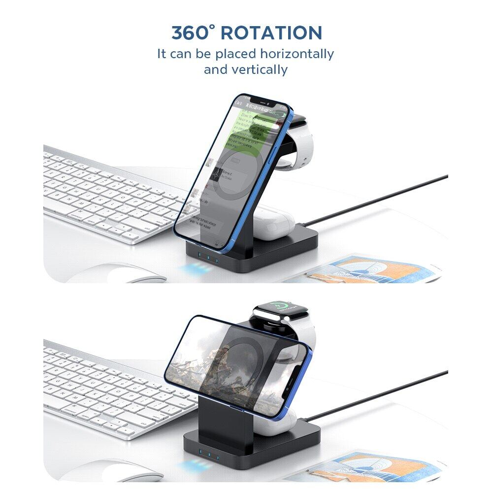 1. 【3 In 1】The magnetic three-charging bracket can simultaneously charge mobile phones, earphones and watches to solve the charging problem of multiple devices in one stop.
