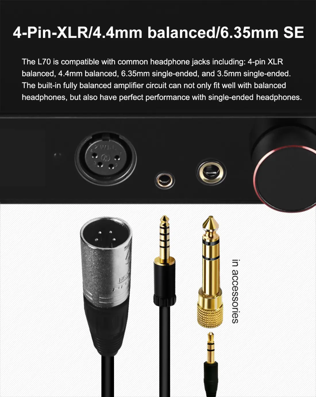 > The built-in fully balanced amplifier circuit performs exceptionally well with both balanced and single-ended headphones. Additionally, the L70 includes four jacks to accommodate most headphones: 4-pin XLR balanced, 4.4mm balanced, 6.35mm single-ended, and 3.5mm single-ended.