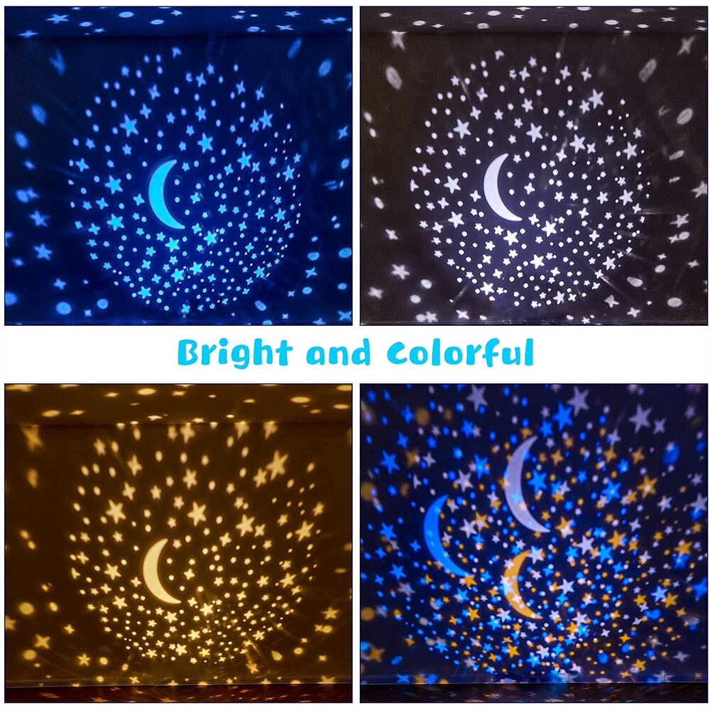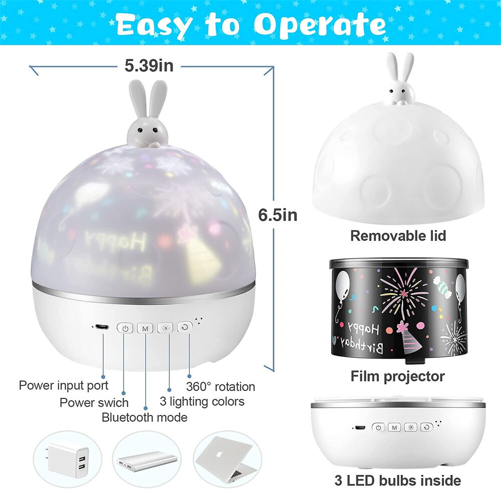 Kids Night Light comes with 3 LED bulbs(white,blue,yellow) ,emit 6 different color modes shinning on wall.Suit for your Christmas, Birthday party, Halloween festivals,family gatherings, dancing party, wedding anniversary or any other occasions.
