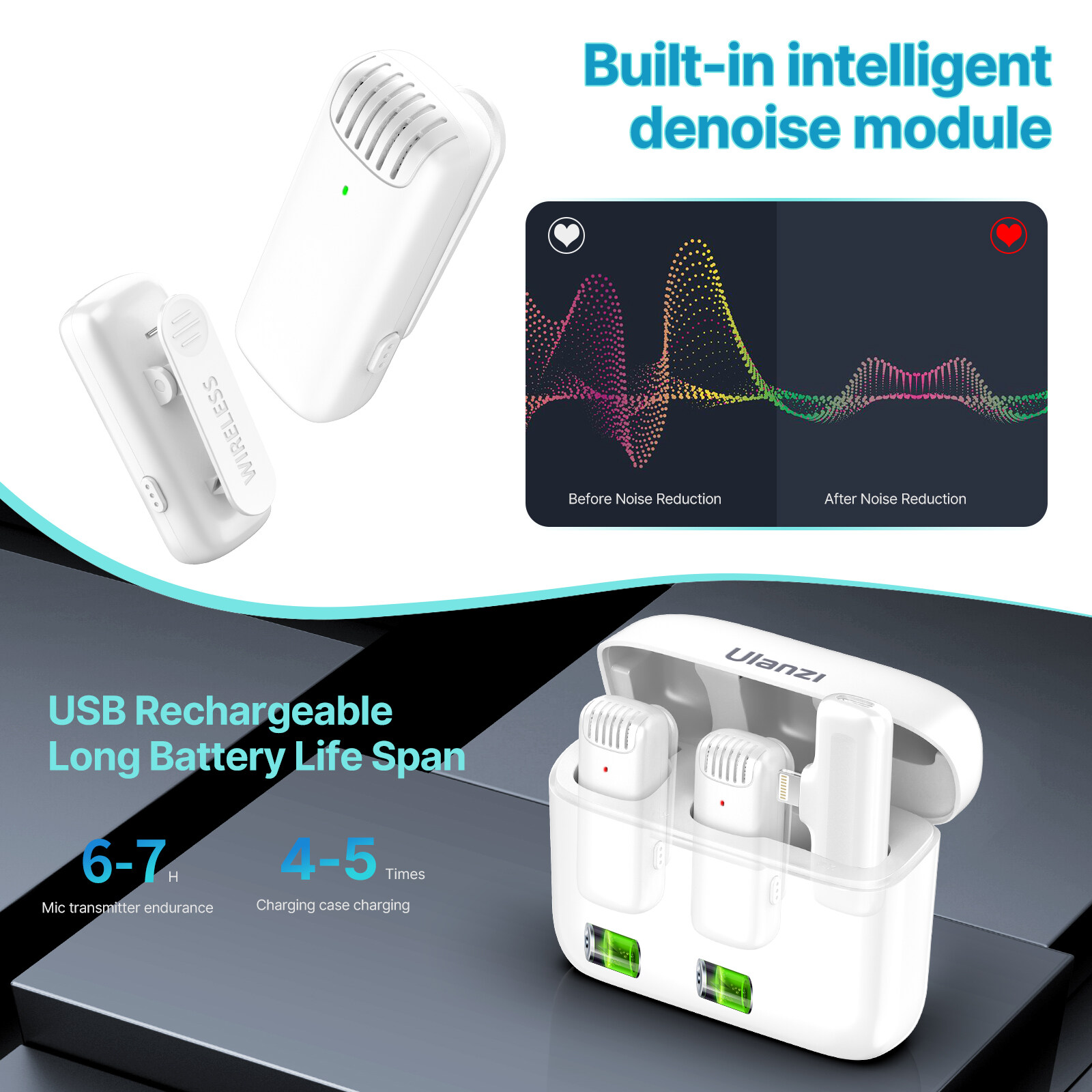 【Long Distance and Clear Transmission】20M effective transmission range helps you to realize long-distance recording; built-in intelligent de-noise module, which can effectively filter out the noise to improve sound quality.