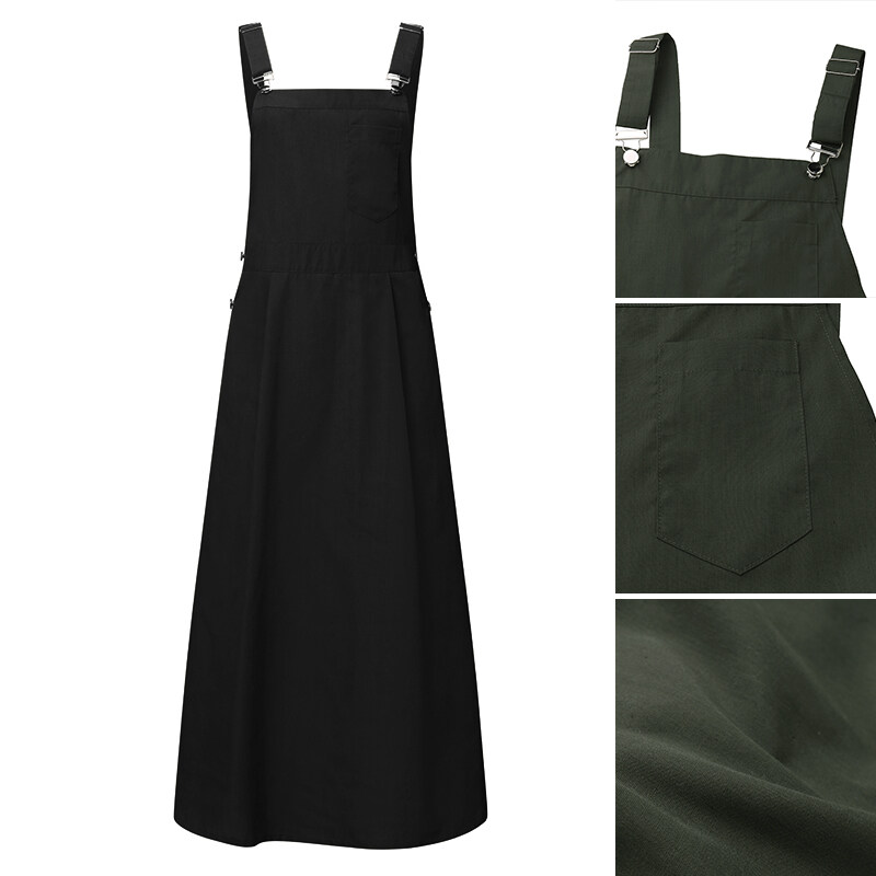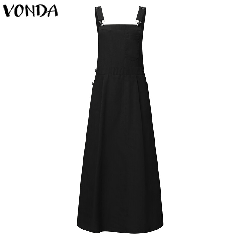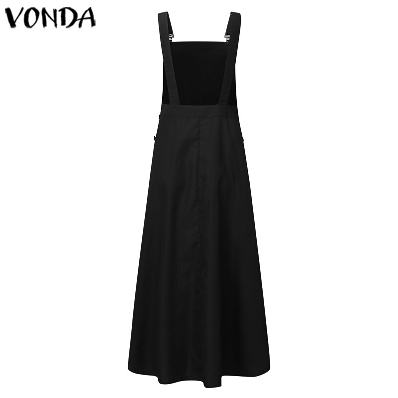 VONDA Women Sleeveless Dungaree Solid Plain Pianfore Overall Strap Long Dress