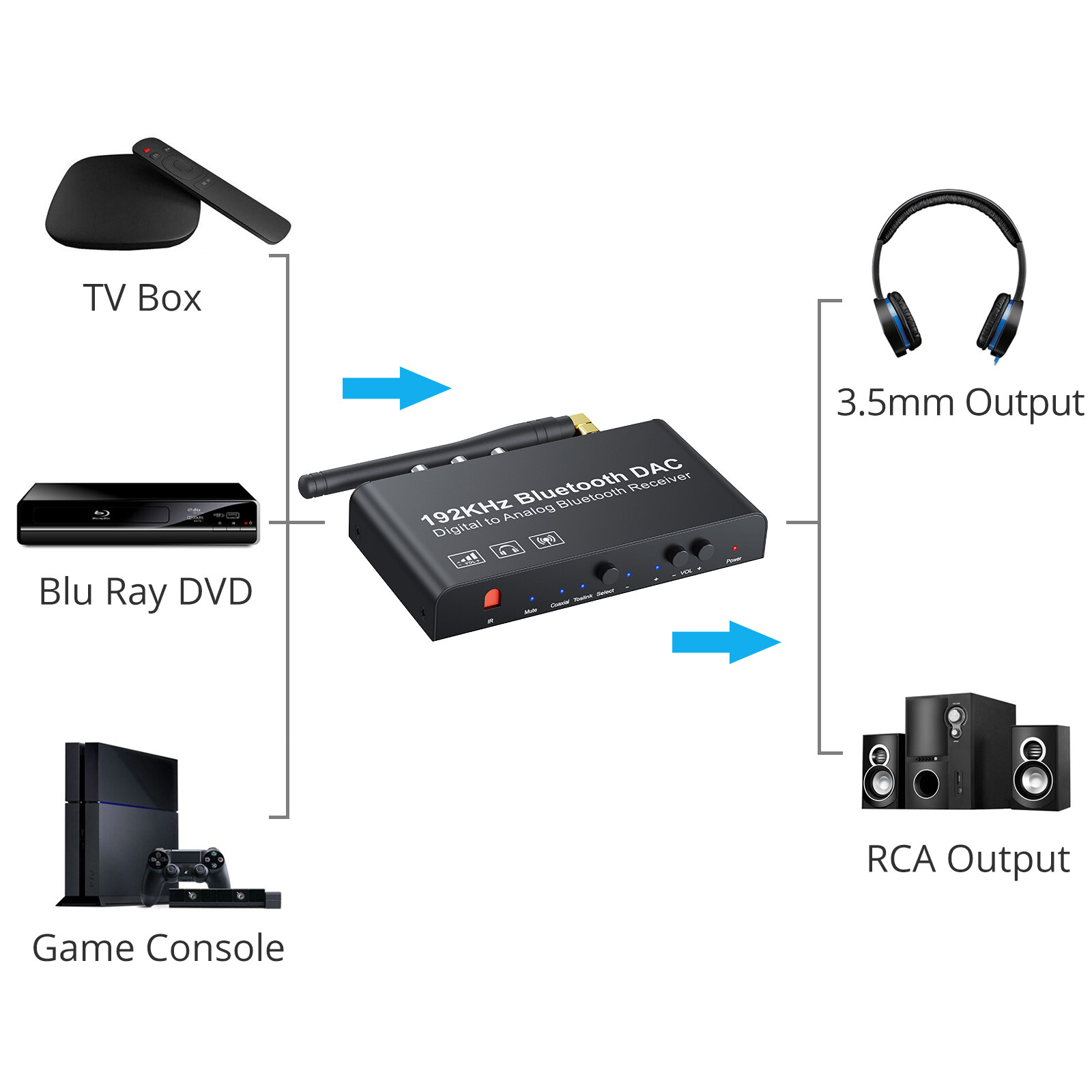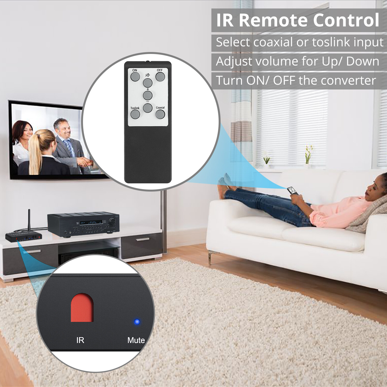 3. With IR wireless remote control, easily adjust volume/ choose coaxial or toslink input/ Mute/ Power ON or OFF by using the IR wireless remote. In order to received signal better please make sure the remote is facing the infrared IR indicator on the converter.