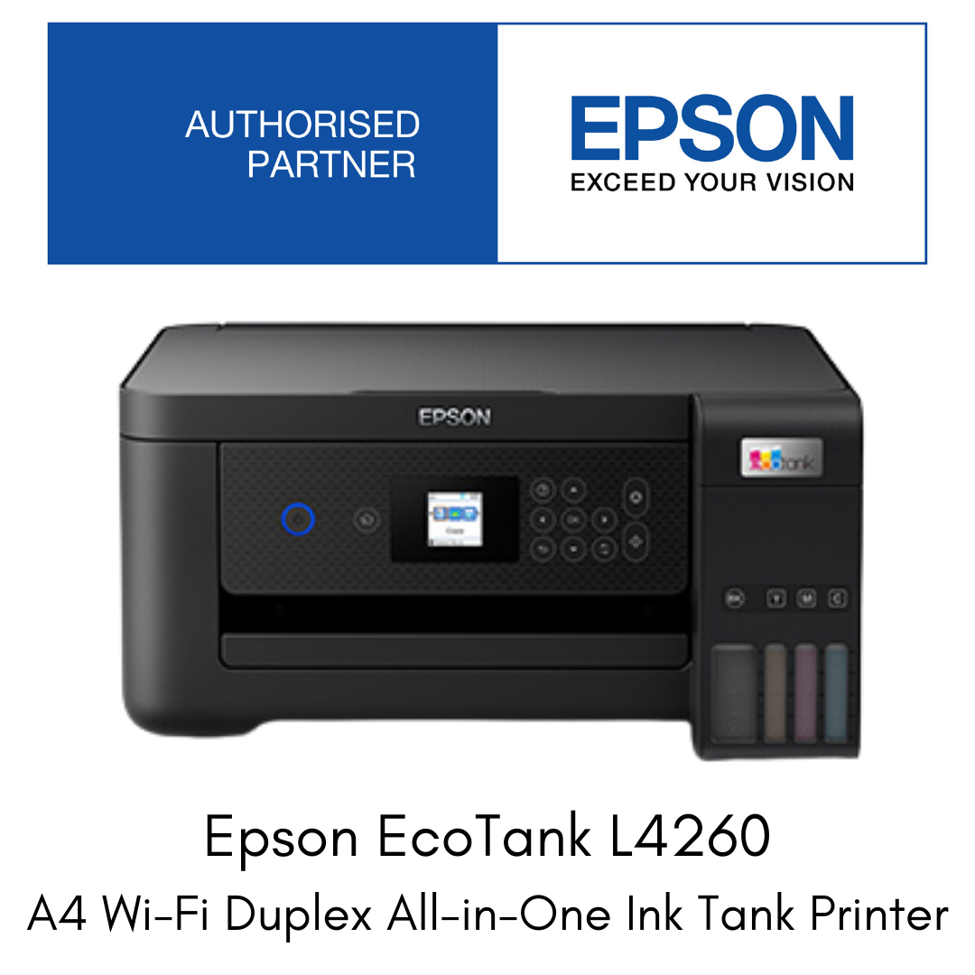 The sleek black EcoTank L4260 is in a class of their own. These printers come with an integrated ink tank system, and compact enough to fit perfectly in any office. Enjoy spill-free refilling with individual ink bottles that have designated nozzles. Get sharp and smudge-free black-and-white documents that are printed using black pigment ink. Equipped with auto-duplex printing, you can print on both sides of paper easily, significantly reducing paper cost and wastage. Choose to print wirelessly over network or directly from connected mobile devices via Wi-Fi Direct. You can also download the Epson Smart Panel app to your mobile device, turning it into an intuitive control centre that enables you to set up, monitor and operate your printer effortlessly. Enhance your business performance with this smart print solution today.