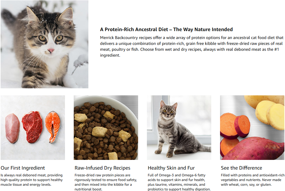 - Merrick Backcountry cat food recipes contain no corn, wheat, or gluten and are made without artificial colors, flavors, and preservatives. Proudly founded in Hereford, TX, crafted in USA facilities