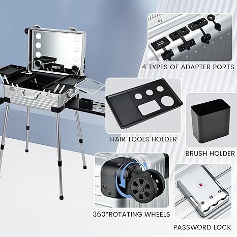 • 【4 POWER OUTLETS】- The aluminum trolley travel makeup train case features four outlets, including a power outlet with a cord, a universal outlet for hair tools like blow dryers or curlers, a mobile outlet with a cord, and USB ports to easily charge smartphones. 【PASSWORD LOCK】- Secure your belongings with a state-of-the-art digital safe lock that requires a three-code password for access, eliminating the hassle of searching for keys every time you need to unlock it.